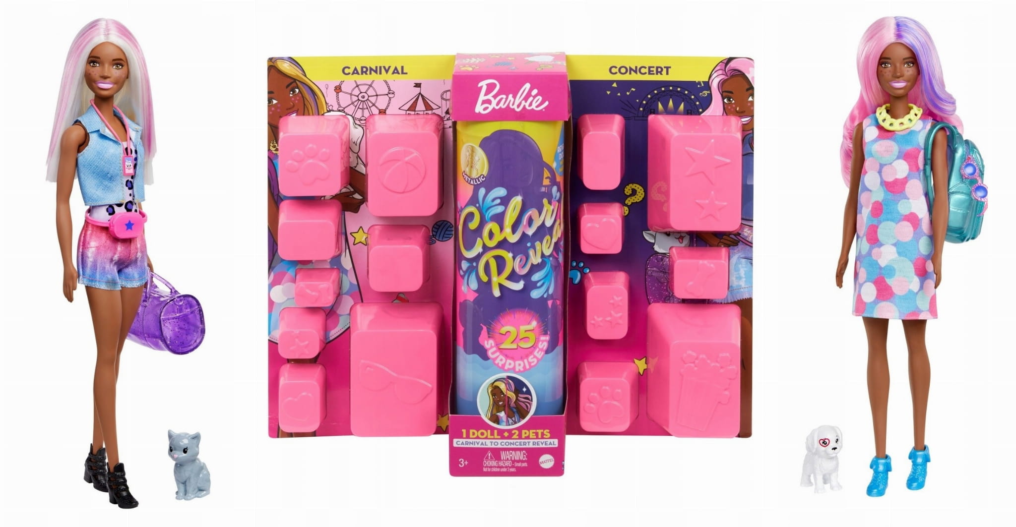 25 niespodzianek, 8 zmian koloru, dwa zwierzątka, dwie stylizacje i lalka Barbie, z którą można wciąż na nowo odgrywać modowe przemiany z dziennych na wieczorne.