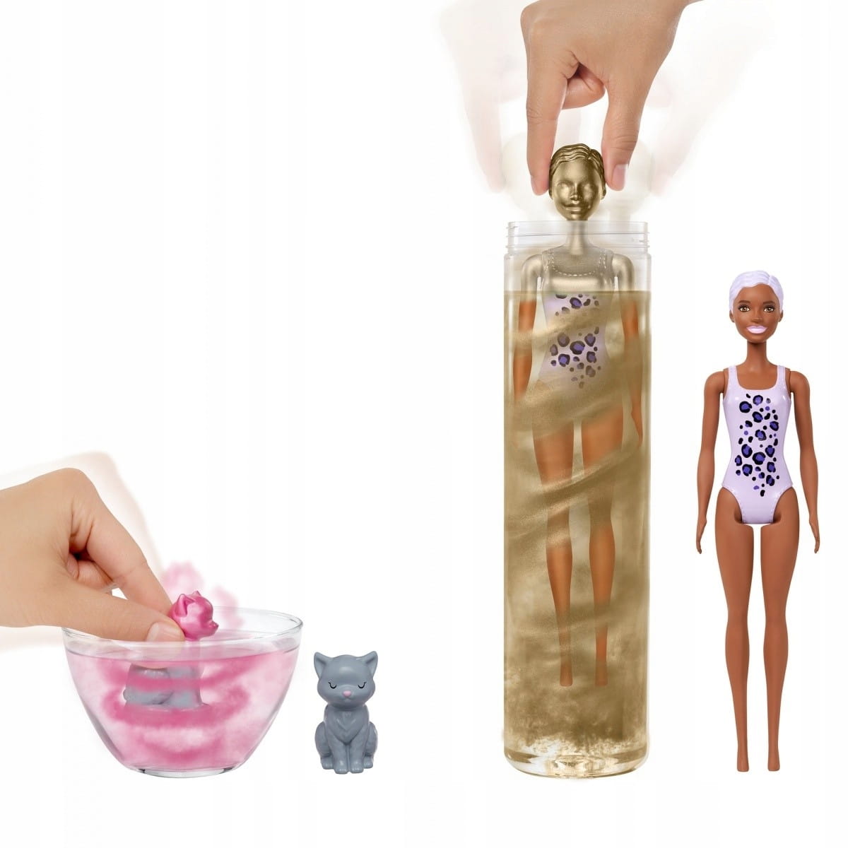 Woda zmieni kolor na złoty, a po wyciągnięciu lalki odkryjesz jej wygląd! Każda lalka ma inny kolor oczu, włosów, skóry i ozdobnego trykotu. Otwórz 14 torebek-niespodzianek, aby odkryć ubranka i akcesoria do dwóch pełnych stylizacji, w tym dwie peruki o długich włosach z funkcją zmiany koloru i małą gąbkę. Znajdziesz też dwa tajemnicze zwierzątka Color Reveal. Czas je odsłonić! Poruszaj zwierzątkami w ciepłej wodzie, aby zobaczyć, jak wyglądają. Ubierz lalkę i zainspiruj się akcesoriami do opowiedania wyjatkowych historyjek, a potem dokonaj niesamowitej transformacji.
