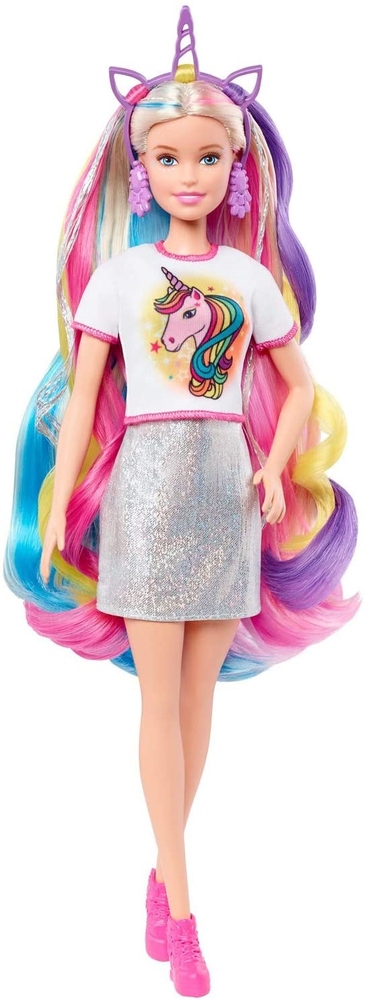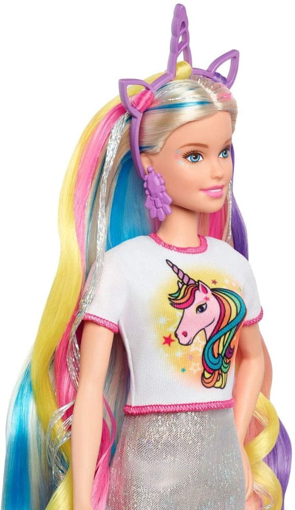 Lalka Barbie Baśniowa fryzura uwielbia magiczną przemianę – ma dwie fantazyjne stylizacje, z których każda zawiera kolorową opaskę z pasemkami włosów, dobraną tematycznie koszulkę i akcesoria. Transformacja w syrenkę lub jednorożca zajmuje tylko chwilę! Załóż koszulkę z grafiką jednorożca lub syrenki, a potem pasującą do niej opaskę. Kolorowe pasemka przyczepione do opaski nadają jeszcze więcej barw włosom Barbie z odcieniami różu i błękitu oraz błyszczącymi kosmykami. Wymyśl bajkową fryzurę, upinając długie, kolorowe, błyszczące włosy lalki Barbie za pomocą dołączonych do zestawu gumek do włosów i 2 spinek. Wow! Co za efekt!