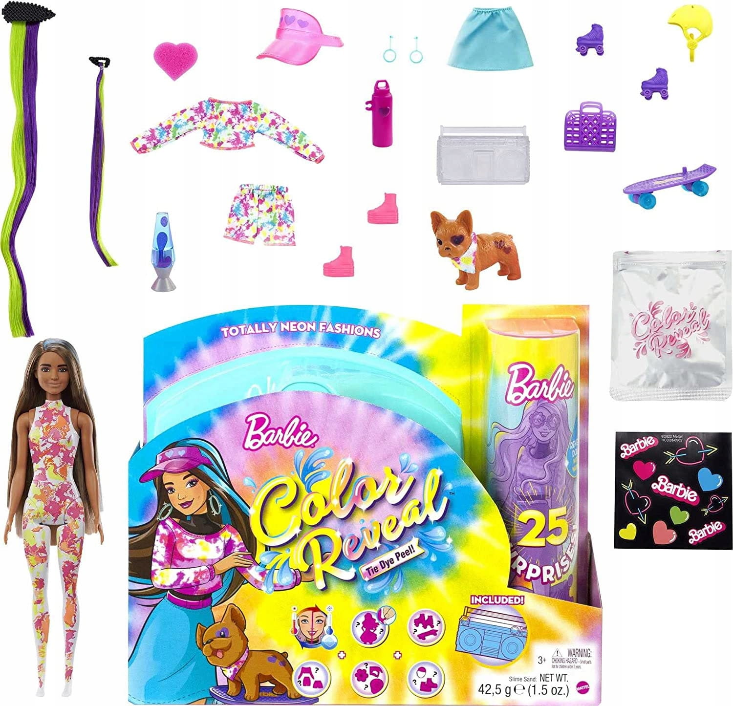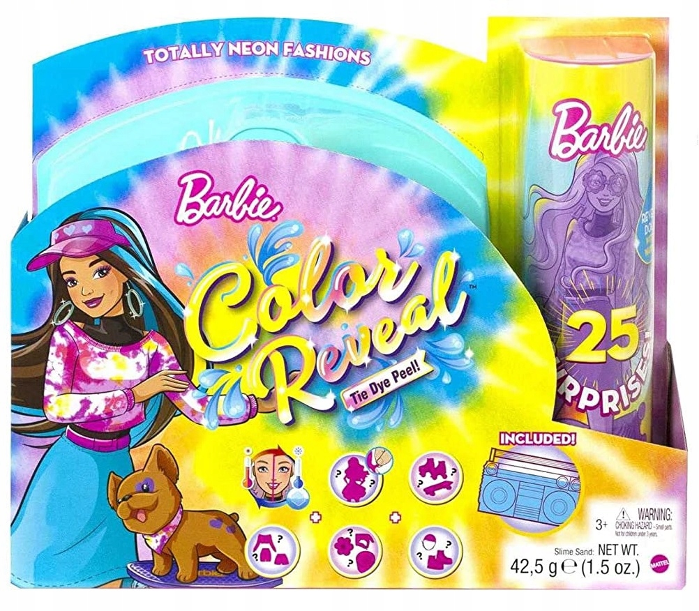 Weź lalkę Barbie Color Reveal, częściowo pokrytą neonową powłoką tie-dye i odklej ją, aby zobaczyć jej wygląd! Następnie otwórz tajemnicze saszetki, aby znaleźć szczeniaczka, przezroczystą skrzynkę w kształcie boomboxa i piasek, deskorolkę dla szczeniaczka, wrotki, ubranka tie-dye, arkusz naklejek i dwa klipsy do przedłużania włosów, jeden dla lalki Barbie i jeden w rozmiarze dla dzieci.