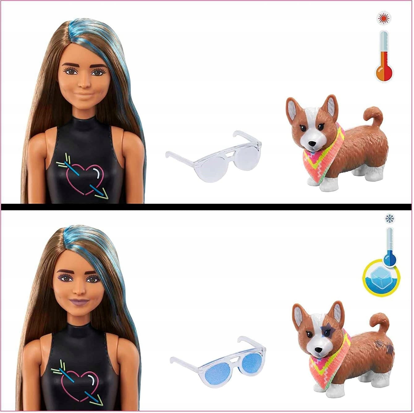 A niespodzianek ciąg dalszy… użyj lodowatej wody, aby aktywować elementy zmieniające kolor, na przykład na twarzy lalki Barbie, okularach przeciwsłonecznych i szczeniaczku. Przy użyciu ciepłej i mocno zimnej wody dzieci mogą w kółko powtarzać momenty zmiany koloru!