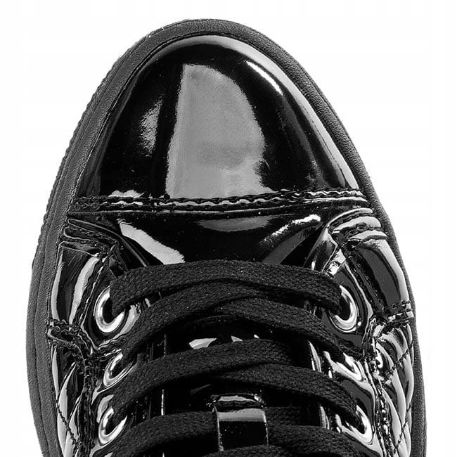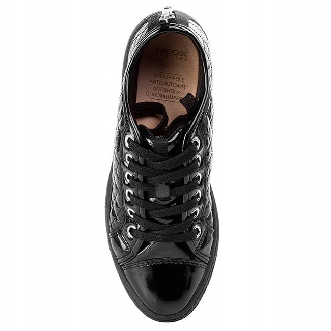 W propozycjach marki Geox dziecięce, sznurowane buty. Dziewczęcy sznurowany model półbuta w czarnym lakierowanym kolorze. Wierzchnia część butów tworzy skóra ekologiczna. Wygodne rzepy dopasowują je do stopy. Wnętrze wykonane z materiału- Mesh. Skórzana wkładka jest wyjmowana, antybakteryjna,perforowana. Podeszwa od spodu na elastycznej gumie w czarnym kolorze. Dzięki systemowi kanalików Respira w niej zawartej, wilgoć z butów odprowadzana jest na zewnątrz.