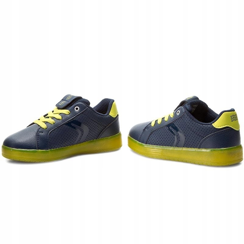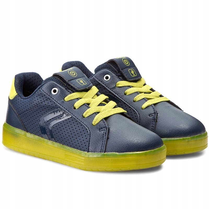 Dziecięce półbuty marki GEOX. Granatowe półbuty są uniwersalnym kolorem, idealnie pasującym w wielu sytuacjach. Ten model zachwyci każde dziecko dzięki świecącej podeszwie. Posiada kilka kombinacji kolorystycznych - może świecić na zielono, czerwono, a także migać. Dodatkowo wyposażony jest w kabel USB, dzięki któremu można naładować akumulatorki od świecącej podeszwy. Z materiałową podszewką z siateczki stopa ma zapewnioną dobrą wentylację. Zapięcie w formie sznurowadeł jest bezpieczne i dokładnie dopasowuje buty. Wkładka miękka, materiałowa z możliwością wyjęcia. Jest antybakteryjna, amortyzuje wstrząsy i sprawia, że stopy oddychają dzięki perforacji w przedniej części. Podeszwa stabilna, a zawarty w niej system Respira dba o wentylację stopy i odprowadza nadmiar wilgoci na zewnątrz.
