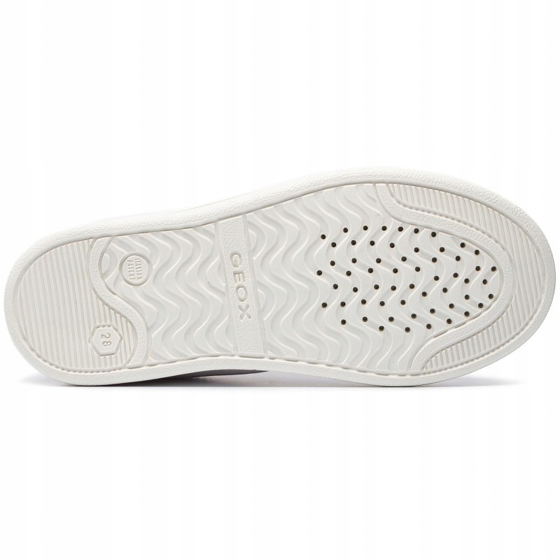 Buty dziecięce marki GEOX. Biały kolor wzbogacono czarnymi akcentami. Cholewka wykonana ze skóry ekologicznej. Miękka i przyjemna w dotyku podszewka z siateczki tworzy komfortowe warunki dla stopy. Wkładka jest skórzana, antybakteryjna, amortyzuje wstrząsy i sprawia, że stopy oddychają. Posiada profilowane zagięcie przy pięcie. Można ją wyjąć ze środka. Sznurowadła idealnie dopasują buty do nogi. Podeszwa z antypoślizgowej gumy wyposażona w membranę Geox Respira zapewnia odpowiednią wentylację. Nadmiar ciepła oraz wilgoci pod postacią pary wodnej wydostaje się przez maleńkie kanaliki. Dzięki temu stopa Twojego dziecka nie będzie się nadmiernie pocić, pozostając sucha i ciepła.