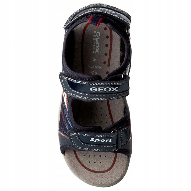 Oddychające sandały dziecięce GEOX. Cholewka wykonana z odpornych na wodę materiałów, wzmocniona przez siatkową podszewkę.Wyjątkową oddychalność dzięki perforowanej podeszwie. Amortyzująca i antybakteryjna wkładka z pianki EVA. Gumowa podeszwa zapewnia przyczepność i trwałość.Dzięki rzepom jest lepsza możliwość dopasowania sandałków do stópek naszych pociech. Model wyposażono w technologię Geox Respira.