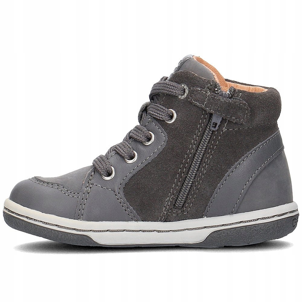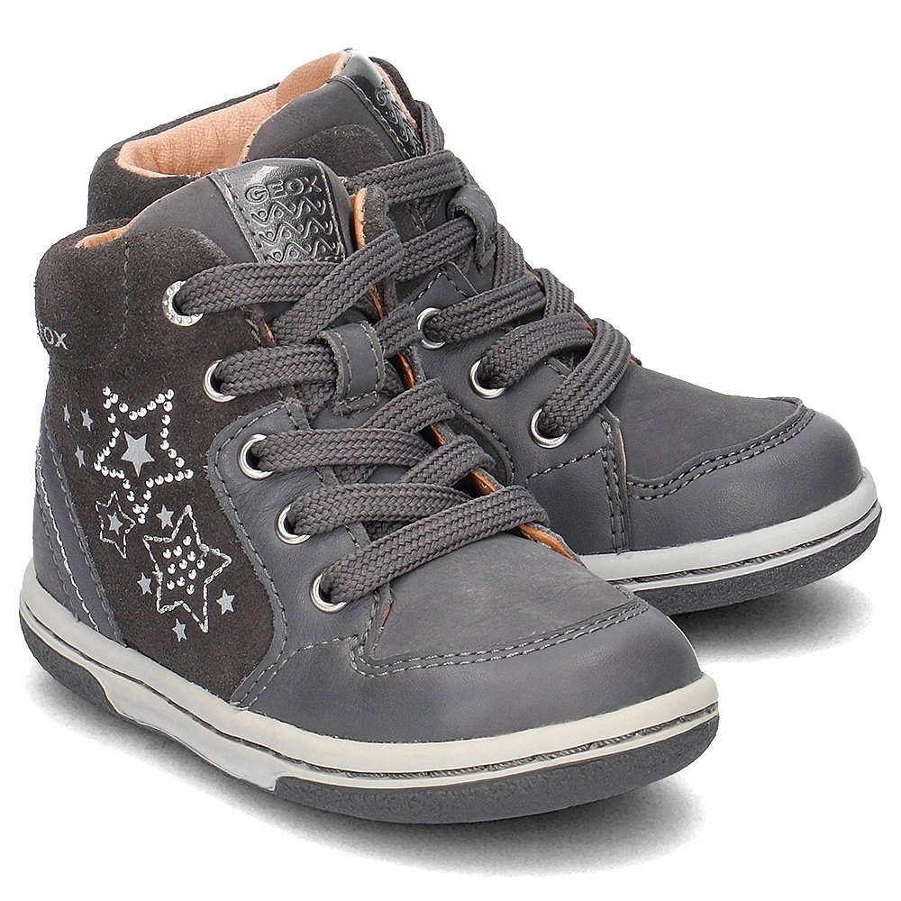 Buty dziecięce marki GEOX. Trzewiki sprostają nadmiarowi energii dziecięcej zarówno w domu, jak i na świeżym powietrzu. Szary kolor skutecznie stonuje krzykliwe zestawienia. Zimowe buty z powodzeniem ocieplają stopy. Skóra naturalna sprzyja utrzymaniu stopy w dobrej kondycji. Dzięki podszewce ze skóry naturalnej stopa będzie efektywnie oddychać. Suwak od strony wewnętrznej ułatwi dziecku zdejmowanie oraz zakładanie obuwia. Mocne sznurowanie dokładnie dopasuje buty do kształtu stóp dziecka. Okrągły nosek pozwoli swobodnie rosnąć dziecięcym paluszkom. Obuwie zdobią gwiazdki po zewnętrznej stronie buta. Podeszwa z technologią Respira dba o przyjemne uczucie ciepła i świeżości przez cały dzień użytkowania.