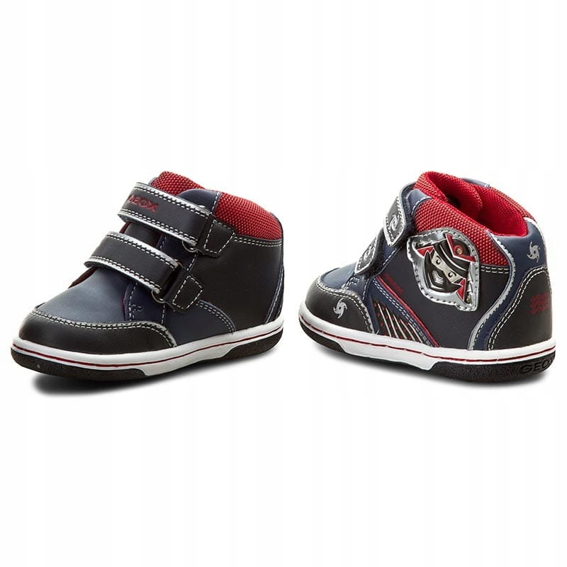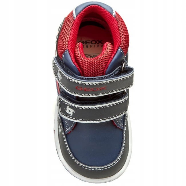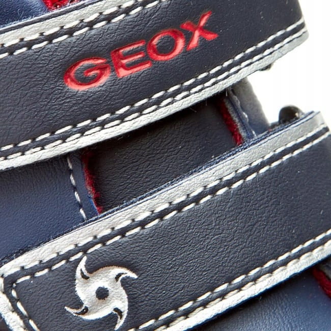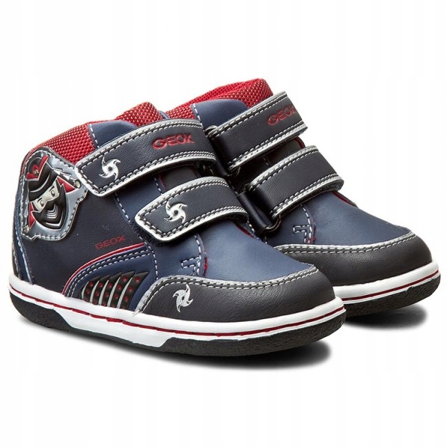 Trzewiki dziecięce marki GEOX. Kolor granatowy spodoba się chłopcu. Cholewkę zdobią czerwone wstawki i motyw ninja. Uwagę zwracają lampki LED zapalające się przy każdym kroku. Skóra ekologiczna cholewki ma wiele praktycznych zalet i dobrze się prezentuje. Materiałowa podszewka stanie na wysokości zadania i spodoba się Twojemu dziecku. Wkładka skórzana, wyjmowana, posiada poduszeczkę pod śródstopiem, która zapewnia stopie komfortowe oparcie. Rzepy to bezproblemowe zapięcie. Podeszwa elastyczna, z antypoślizgowym bieżnikiem, została wyposażona w technologię Geox Respira. Jest to system maleńkich kanalików pozwalających na odprowadzanie nadmiaru ciepła oraz wilgoci, nie pozwalając jednak na wnikanie przez nie wody do wnętrza buta.
