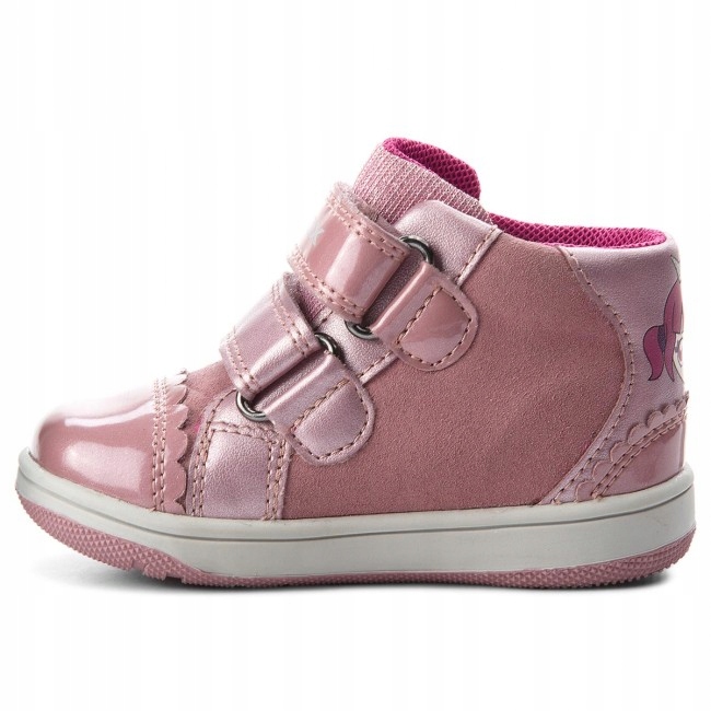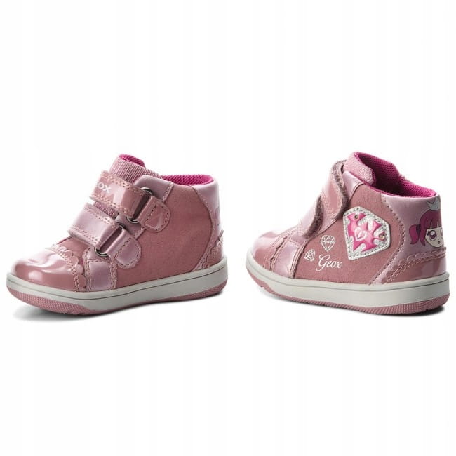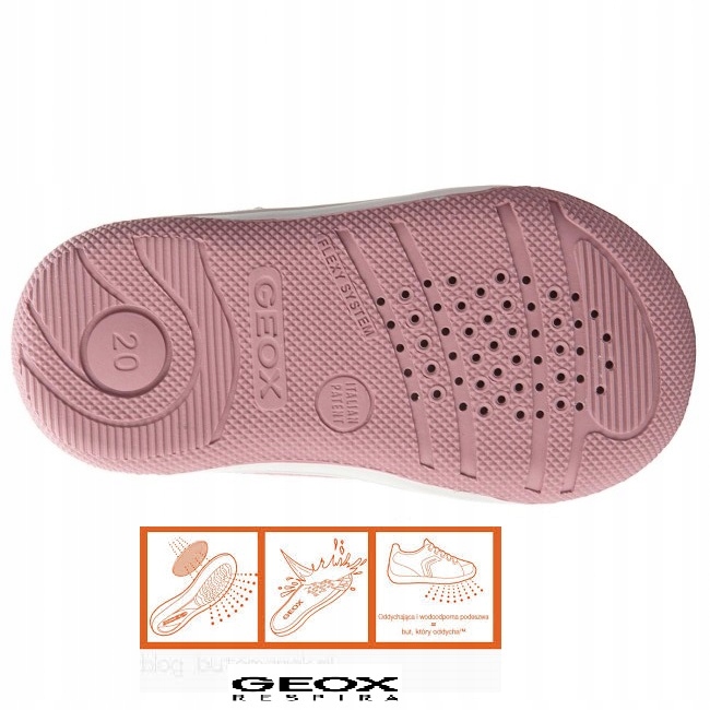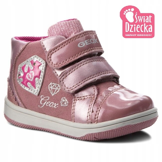 Wygodne, profilaktyczne dziecięce trzewiki renomowanej firmy GEOX, uszyte według wszelkich rynkowych standardów. Buciki uszyte ze skóry ekologicznej z dodatkiem nubuku, od wewnątrz zostały wyposażone w specjalnie wyprofilowaną, z naturalnej skóry, wkładkę dla prawidłowego ułożenia nóżki, oraz usztywniony zapiętek zabezpieczający staw skokowy przed skręceniem. Niewątpliwą atrakcją w butach są światełka które migają po uprzednim włączeniu. Na boku od zewnętrznej strony guzik włączający i wyłączający światełka. Odpowiednio szeroki czubek umożliwia swobodę palców i nie ogranicza ruchu stawów. Podeszwa elastyczna z antypoślizgowym bieżnikiem dla lepszej stabilizacji nóżek dziecka. została również wyposażona w technologię Geox Respira. Jest to system maleńkich kanalików pozwalających na odprowadzanie nadmiaru ciepła oraz wilgoci.