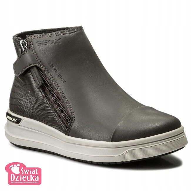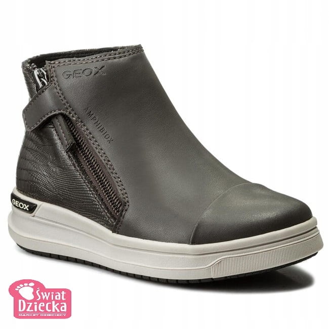 Dziewczęce trzewiki z nowej kolekcji Geox sprawdzą się podczas jesiennych dni! Czarna cholewka z ekologicznej skóry przyjemnie układa się na nodze, a ciekawy wzór przy pięcie przyciąga wzrok. Ozdobne zapięcie po boku umożliwia szybkie i łatwe zakładanie. Wewnątrz obszyte delikatnym materiałem tak żeby nie obcierał skóry stopy. Ocieplona filcem wkładka zapobiega marznięciu stóp. Solidna podeszwa ze specjalnej mieszanki gumy odznacza się bardzo dobrą przyczepnością. W podeszwie oraz w górnej części cholewki umieszczono technologię Amphibiox, która ma wodoodporne właściwości, co więcej pozwala nodze oddychać. Dodatkową zaletą jest technologia Geox Respira tworząca wewnątrz buta idealny mikroklimat.