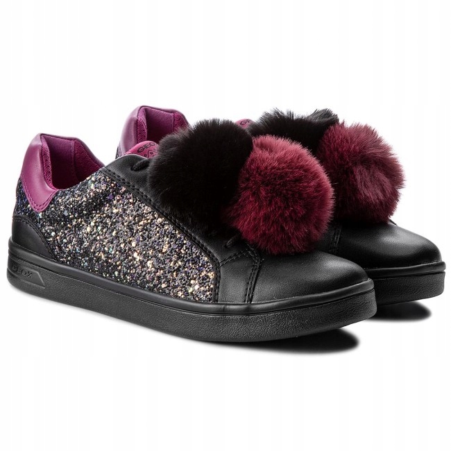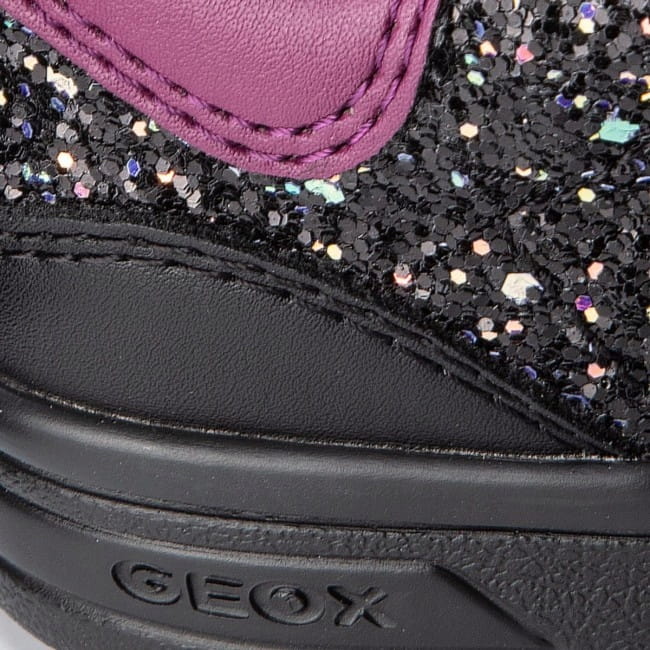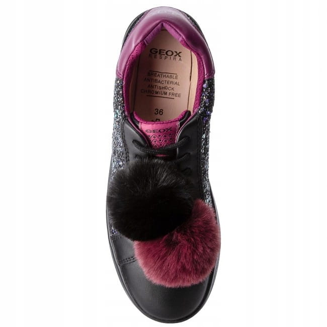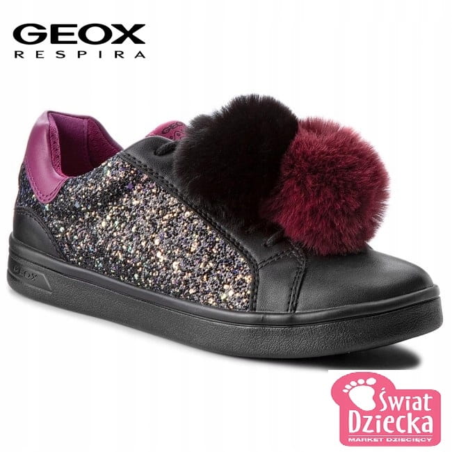 W najmodniejszym stylu sportswear, trampki z kolekcji dla dziewczynki marki Geox to obowiązkowy nabytek w tym sezonie. Buty te wykonane są z skóry ekologicznej i tkaniny w czarnym kolorze i fioletowymi wstawkami. Model J Djrock Girl posiada wewnątrz wyściółkę z tkaniny mesh, dzięki której małe stopy odczują wielką wygodę. Model, który spodoba się dzieciom! Ozdobę fasonu stanowi brokat oraz pompony które można w każdym momencie zdjąć. Sznurowadła - dopasowują obuwie do konkretnego podbicia i tęgości stopy dziecka. Podeszwa została wyposażona w technologię Geox Respira. Jest to system maleńkich kanalików pozwalających na odprowadzanie nadmiaru ciepła oraz wilgoci.