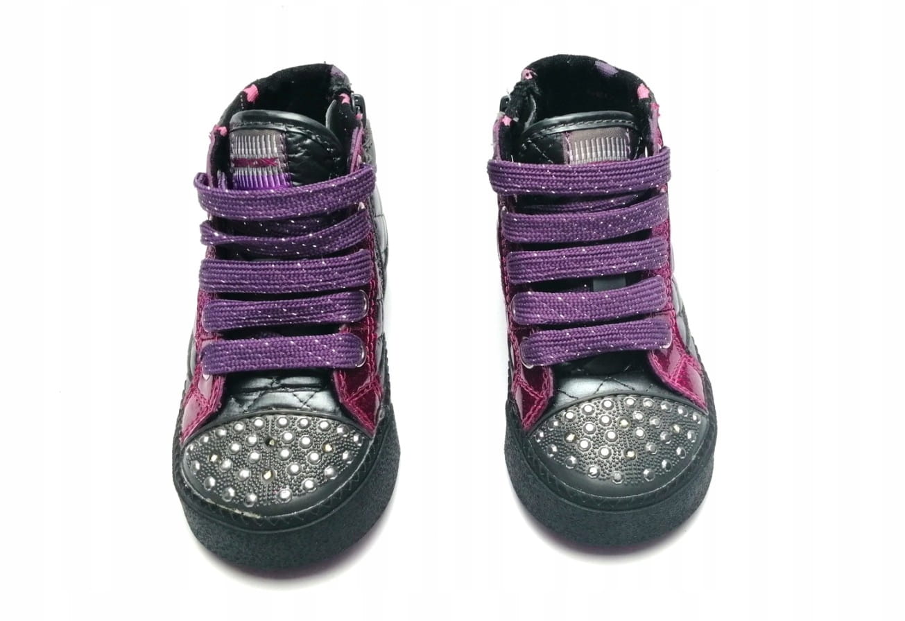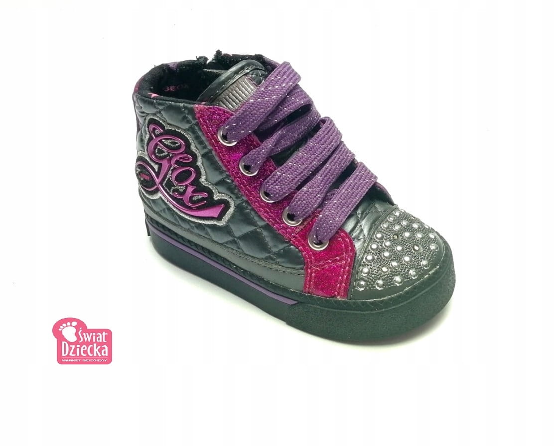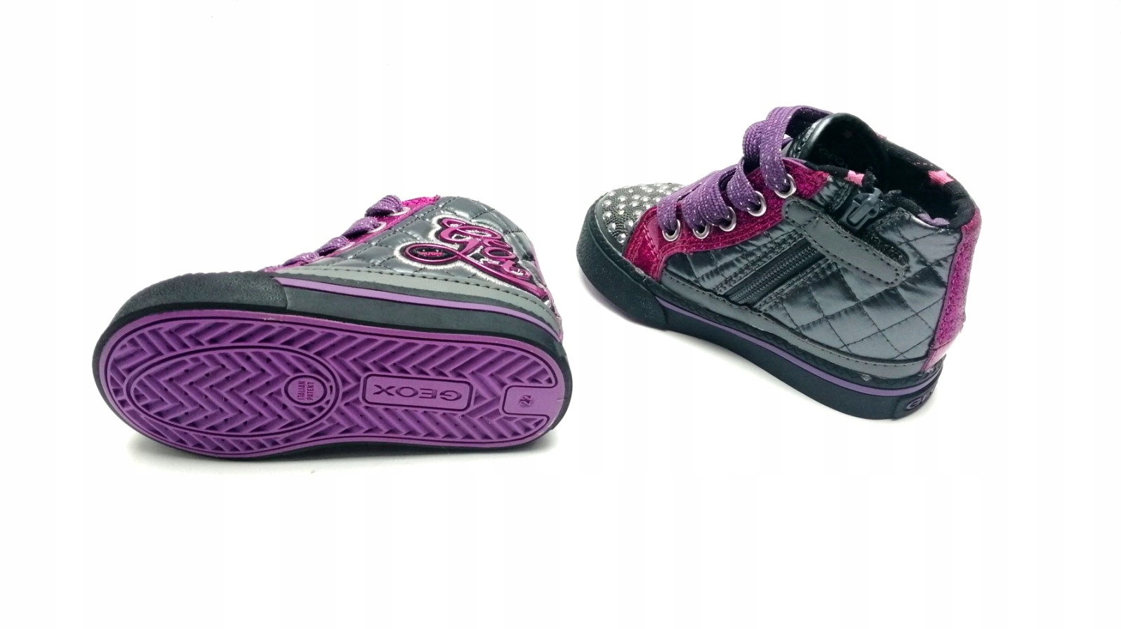 Szaro- fioletowy kolor buta z pewnością spodoba się dziewczynką. Niewątpliwą atrakcją w butach jest świecący nosek buta, która miga przy każdym kroku. Na boku od zewnątrz na logo GEOX guzik włączający i wyłączający światełka. Modny pikowany materiał+ nylon z dodatkiem brokatowej ekoskóry to idealny materiał cholewki. Materiałowa podszewka stanie na wysokości zadania i zapobiegnie otarciom. Wkładka miękka,skórzana z perforacją. Pięta usztywniona, nosek zabezpiecza palce przed urazami. Zapięcie w formie sznurowadeł jest bezpieczne i dokładnie dopasowuje buty. Dodatkowo suwak w wewnętrznej stronie buta, umożliwia szybkie i łatwe zakładanie. Podeszwa w technologii Respira odprowadza pot i wilgoć, pozostawiając uczucie świeżości i przyjemnego ciepła.