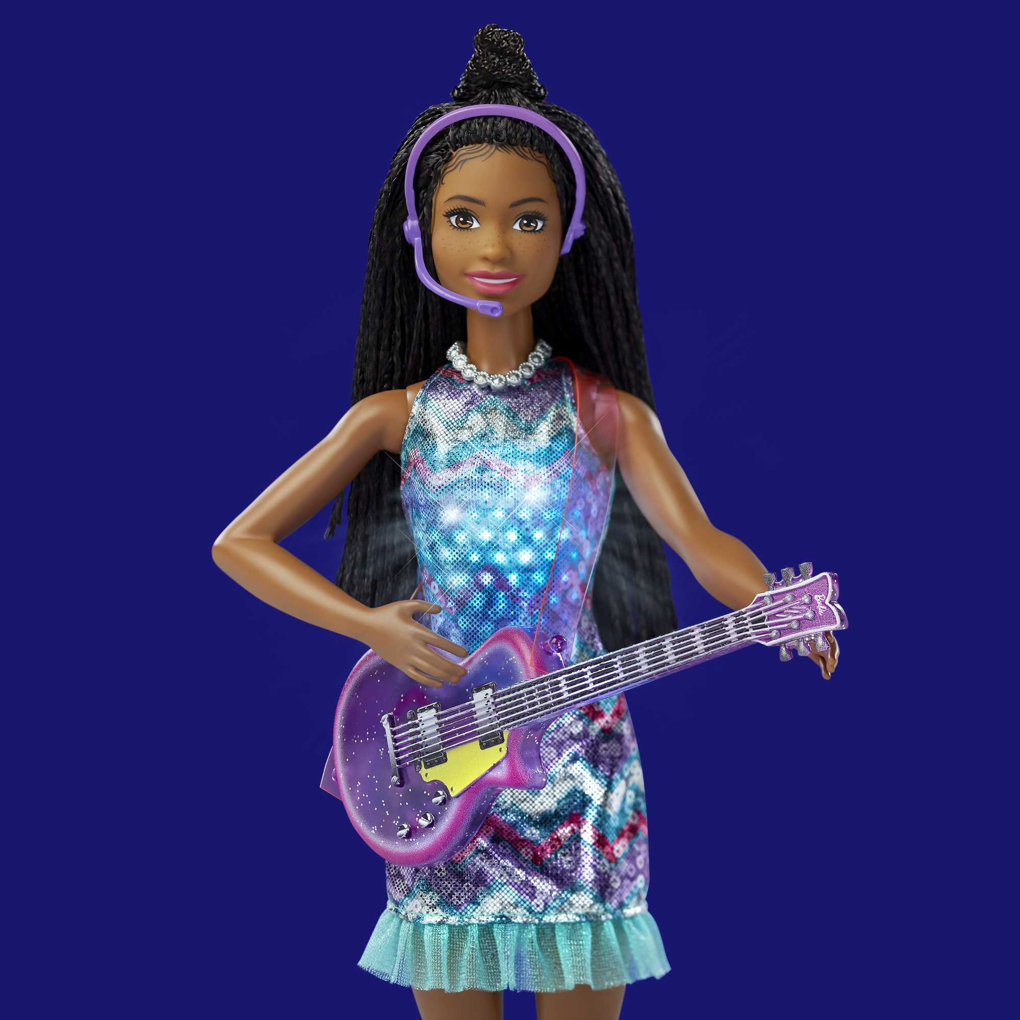 Unieś rękę lalki i przyłóż mikrofon do ust Barbie, aby aktywować muzykę oraz światełka na sukience! Podnoś i opuszczaj rękę lalki, aby powtarzać niezwykły moment i cieszyć się porywającymi melodiami.