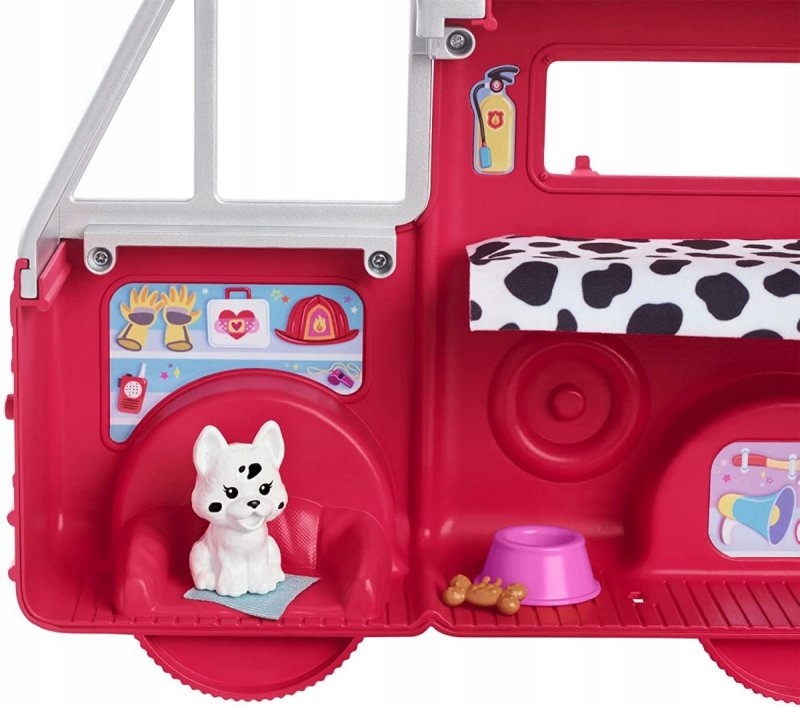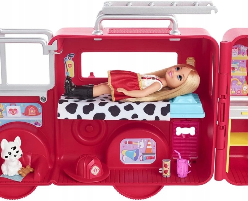 Dzieci mogą pomóc lalce Chelsea ruszyć na ratunek w wozie strażackim z obracającymi się kółkami, który inspiruje do nieskończonych opowieści. Gdy Chelsea i jej piesek przybędą na miejsce, możesz od razu ruszyć do akcji z drabiną i wężem strażackim, a potem rozłożyć zestaw, aby odkryć dodatkowe elementy, takie jak umywalka, stanowisko pierwszej pomocy, łóżko piętrowe i nie tylko.