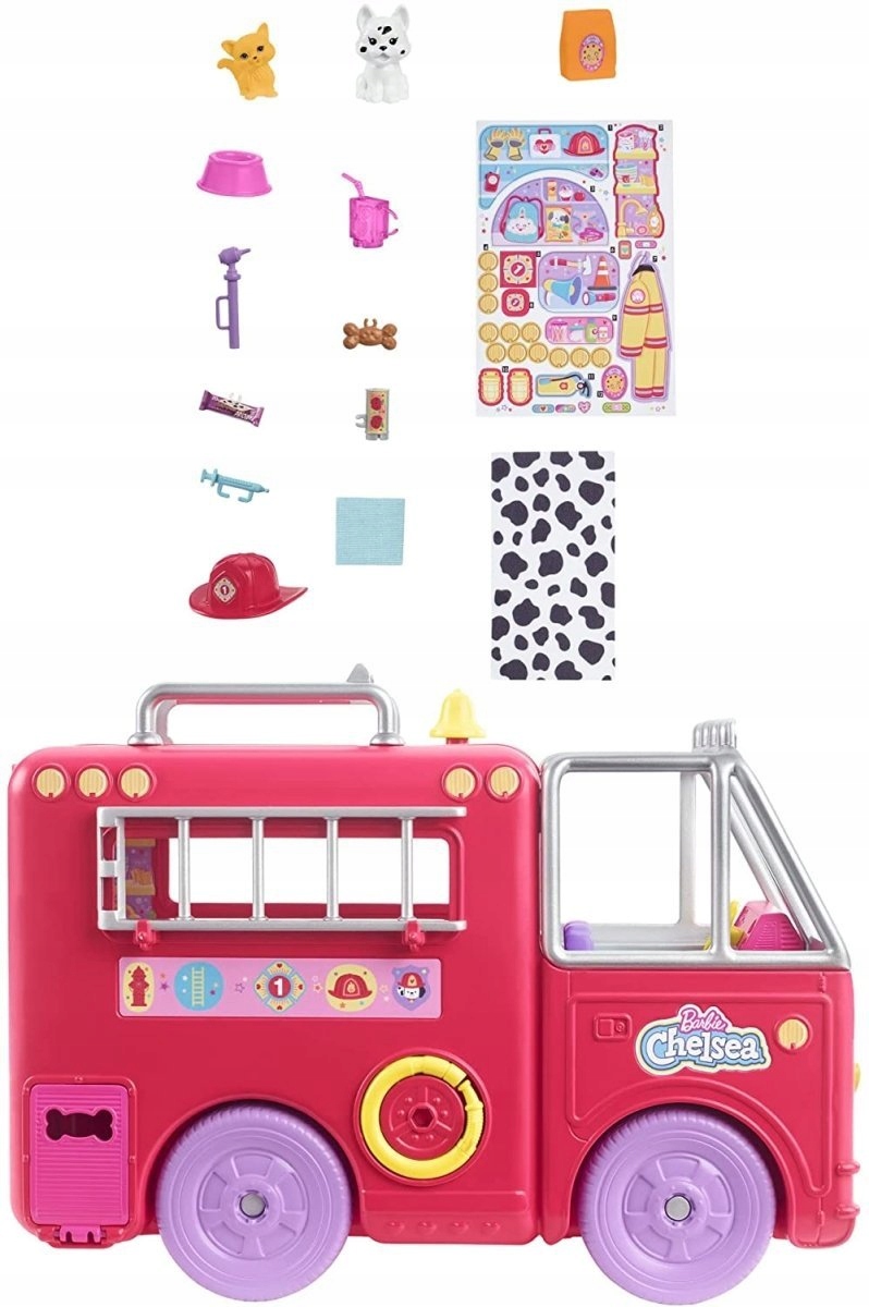 Lalka Chelsea ma na sobie uroczy strój strażacki ze zdejmowaną spódniczką, kaskiem i bucikami. Arkusz naklejek pozwala ozdobić pojazd, a ponad 15 akcesoriów, w tym fotel i figurki zwierzątek, zapewniają jeszcze więcej możliwości zabawy. Zestaw można łatwo złożyć i schować w nim lalkę oraz akcesoria, aby zabrać je, gdziekolwiek chcesz.