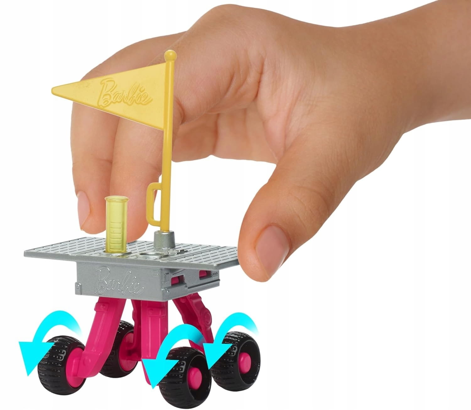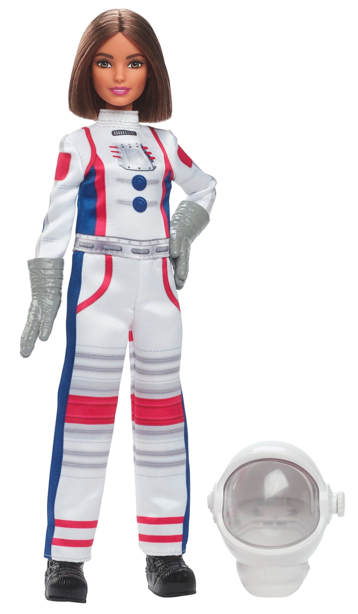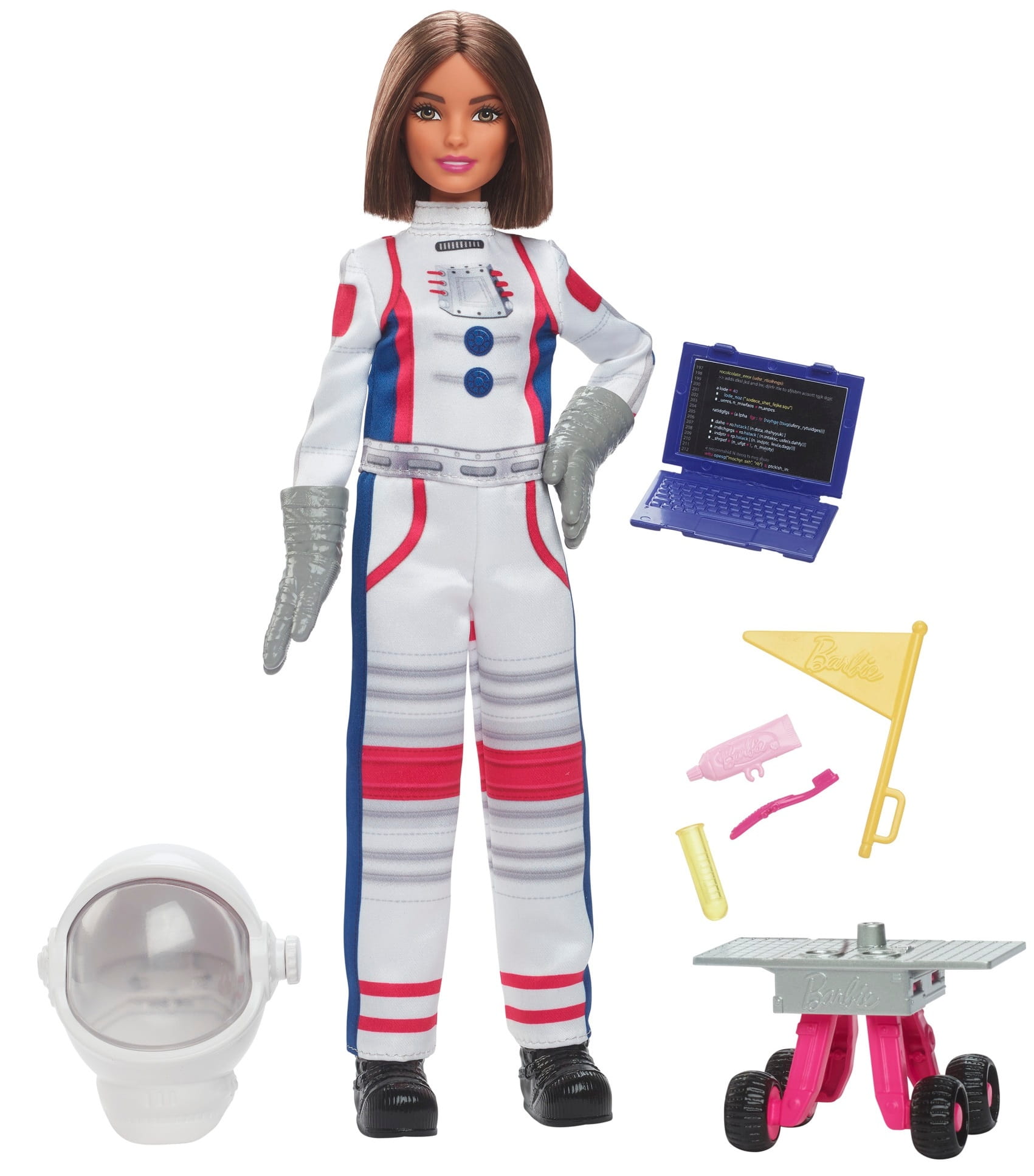 Lalka Barbie® Astronautka ma na sobie kombinezon kosmiczny z kultowymi detalami, a w zestawie znajdziesz też 10 akcesoriów tematycznych, w tym hełm z ruchomą osłoną i innym „widokiem” oraz łazik kosmiczny na kółkach.