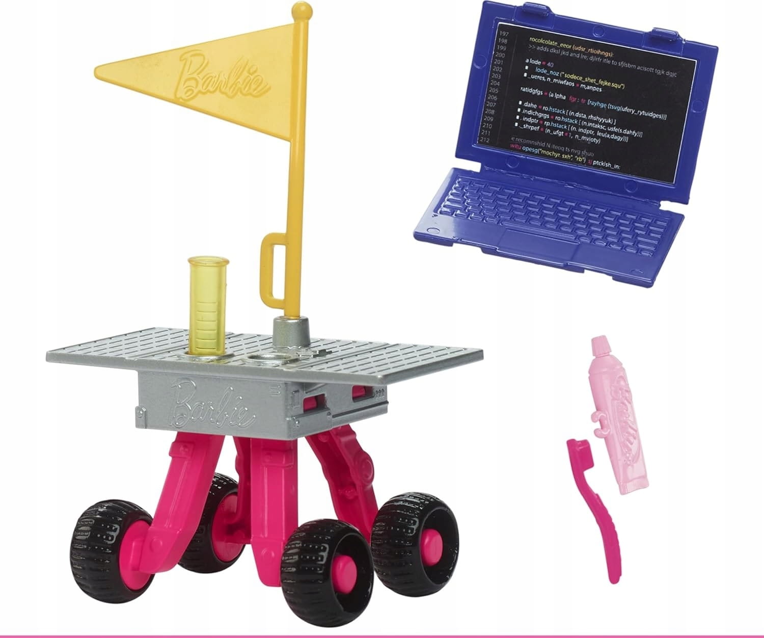 Zabawę urozmaicają dodatkowe akcesoria, takie jak laptop i flaga, którą Barbie® może zaznaczyć swoją obecność.
