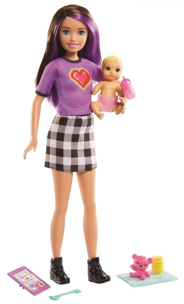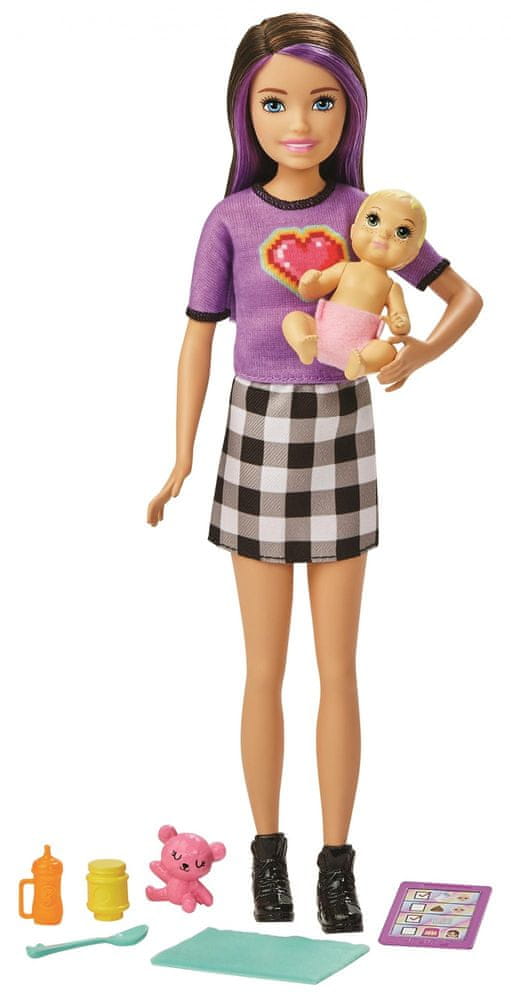 Najnowszy zestaw Barbie Skipper zawiera wszystko, co niezbędne do odegrania roli opiekunki jasnowłosego bobaska. Lalka bobas ma łatwą do zakładania i zdejmowania materiałową pieluszkę – przypomina prawdziwą i zachęca do zabawy w odgrywanie ról! Noszone przez nianię modne ubranie oraz buciki podkreślają unikalny styl.