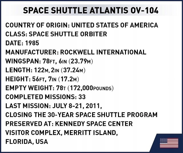 Był jednym z pięciu promów wielokrotnego użytku, które wykorzystywano z przeznaczeniem do transportu ludzi oraz sprzętu na orbitę Ziemi. Pierwszy lot miał miejsce 3 października 1985 roku. Przez 26 lat służby Atlantis wykonał 33 misje i spędził 306 dni na orbicie okołoziemskiej. Lądowanie promu 21 lipca 2011 roku po udanej misji zaopatrzenia Międzynarodowej Stacji Kosmicznej zakończyło erę wahadłowców. Po zakończeniu służby Atlanits został przetransportowany do Kennedy Space Center Visitor Complex gdzie pełni teraz funkcję muzealną.