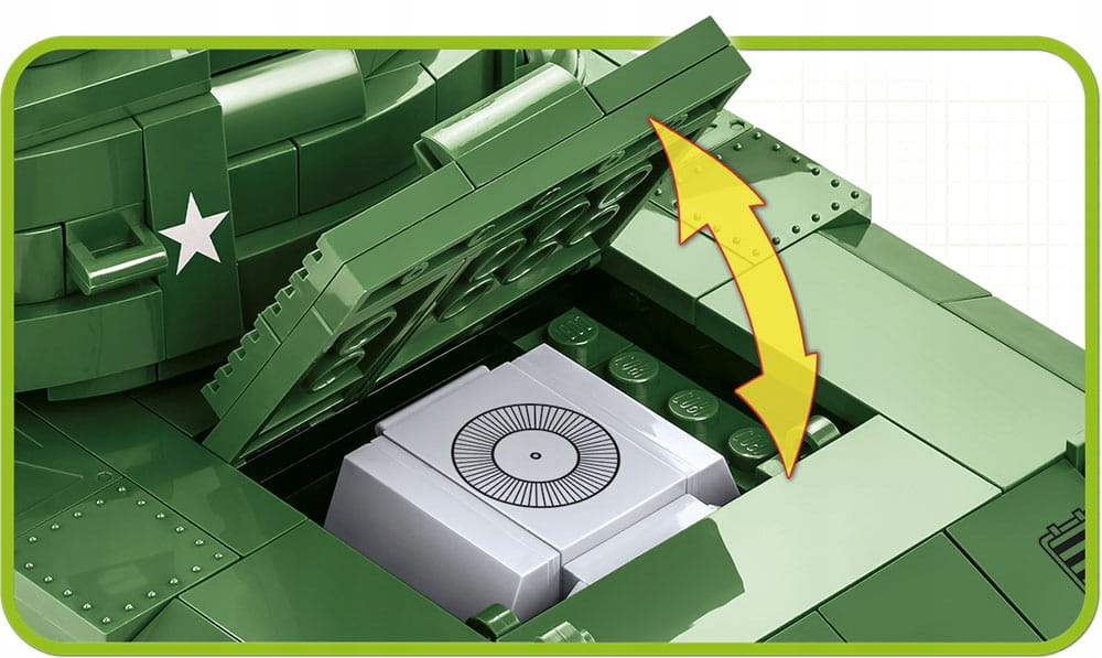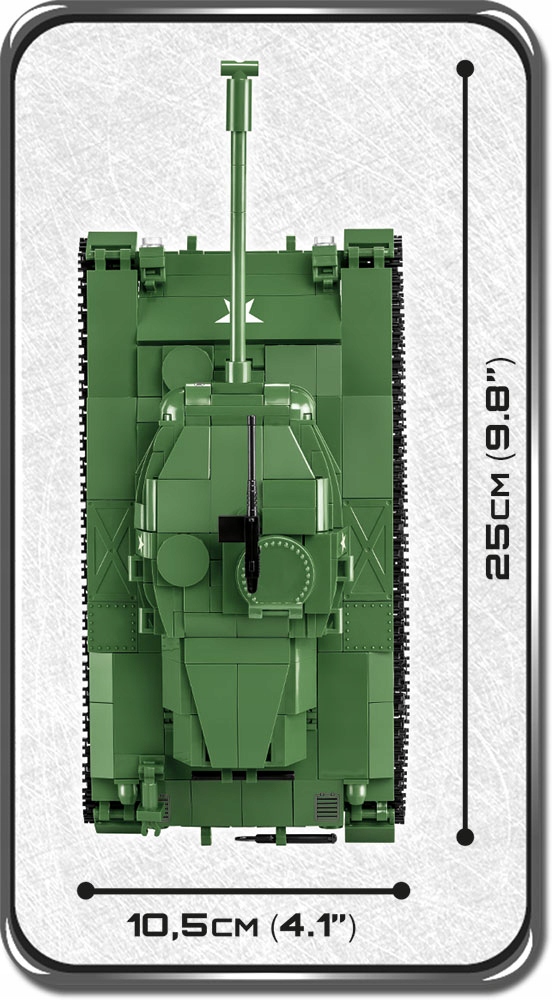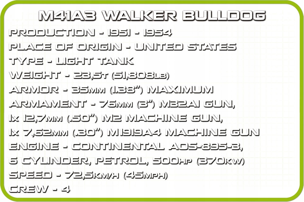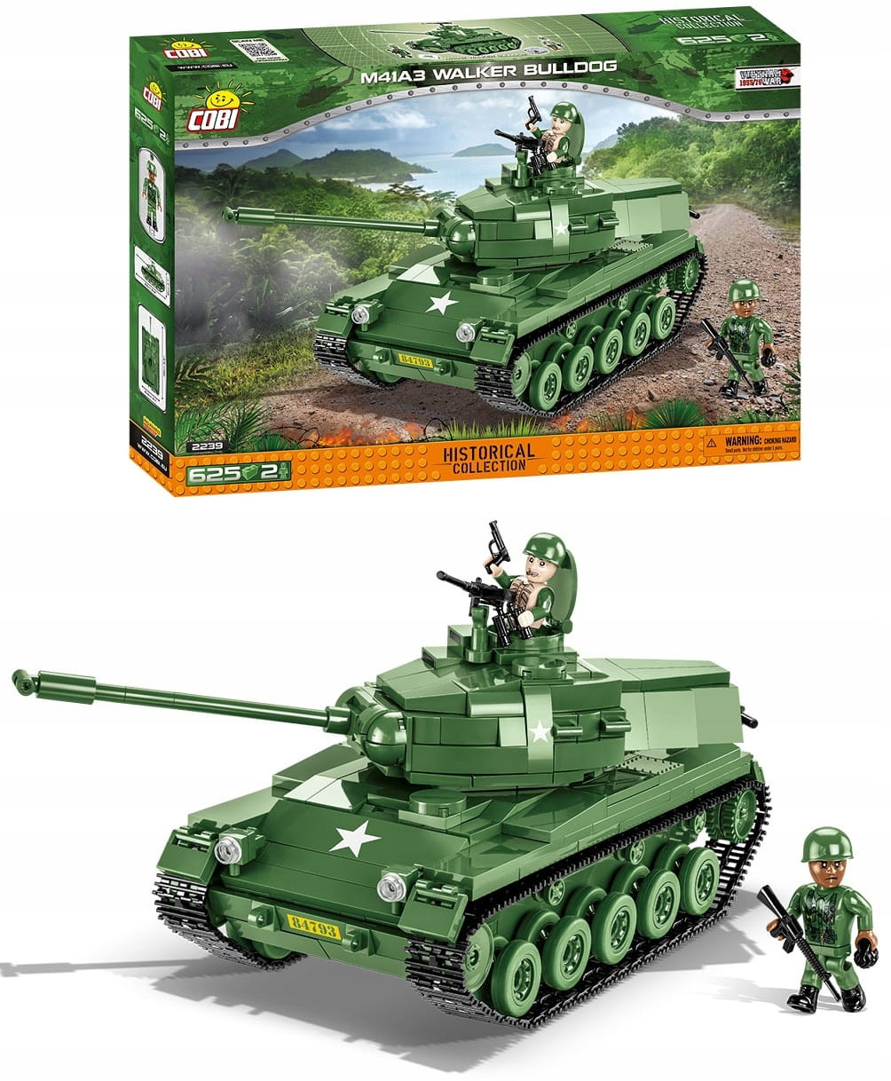 Z zestawu ponad 625 klocków konstrukcyjnych COBI wybudujesz amerykański czołg lekki M41A3 Walker Bulldog. Model zawiera elementy pokryte wysokiej jakości nadrukami, które nie ścierają się nawet w trakcie intensywnego użytkowania. Konstrukcja doskonale odzwierciedla oryginalne kształty swojego historycznego pierwowzoru. Ruchome koła i pracujące gąsienice, otwierane włazy, dostęp do klockowego silnika, ruchoma wieża i bardzo charakterystyczna lufa oraz dwie figurki amerykańskich żołnierzy wraz z akcesoriami gwarantują satysfakcję z posiadania tego zestawu! Całość uzupełnia tabliczka z nazwą pojazdu.
