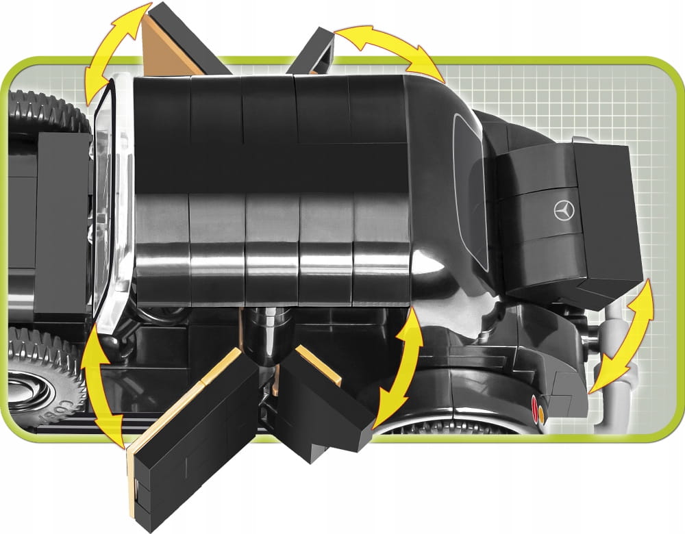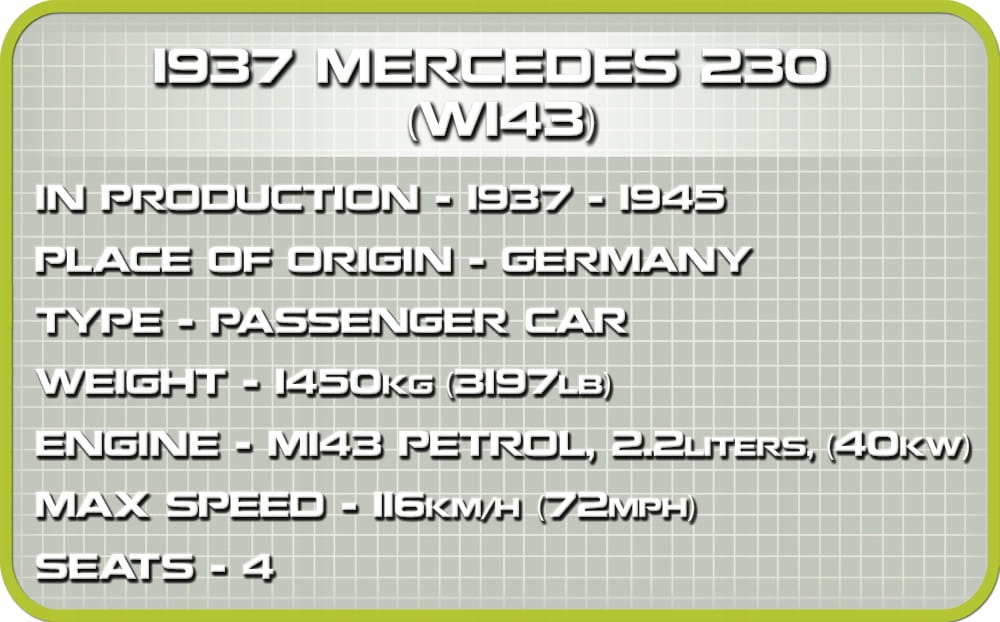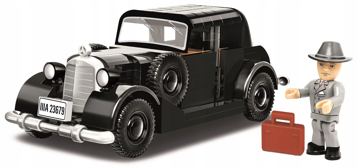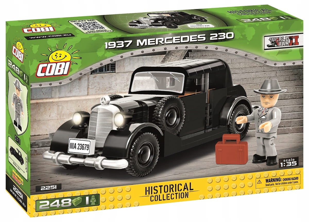Z zestawu 248 klocków konstrukcyjnych COBI wybudujesz historyczny samochód osobowy 1937 Mercedes 230. Model zawiera elementy pokryte wysokiej jakości nadrukami, które nie ścierają się nawet w trakcie intensywnej zabawy. Zaletą jest konstrukcja, która w wyjątkowy sposób odzwierciedla oryginalne kształty swojego historycznego pierwowzoru w modelarskiej skali 1:35. Ruchome koła, otwierane drzwi i bagażnik to zalety tego modelu. Samochód zaskakuje nowymi rodzajami klocków, które świetnie sprawdzają się przy budowie pojazdów oraz ułatwiają dalsze przeróbki i projektowanie własnych konstrukcji. Do zestawu dołączona jest figurka inspirowana znaną postacią historyczną. Całość zestawu uzupełnia klocek zawierający nadrukowaną nazwę samochodu.