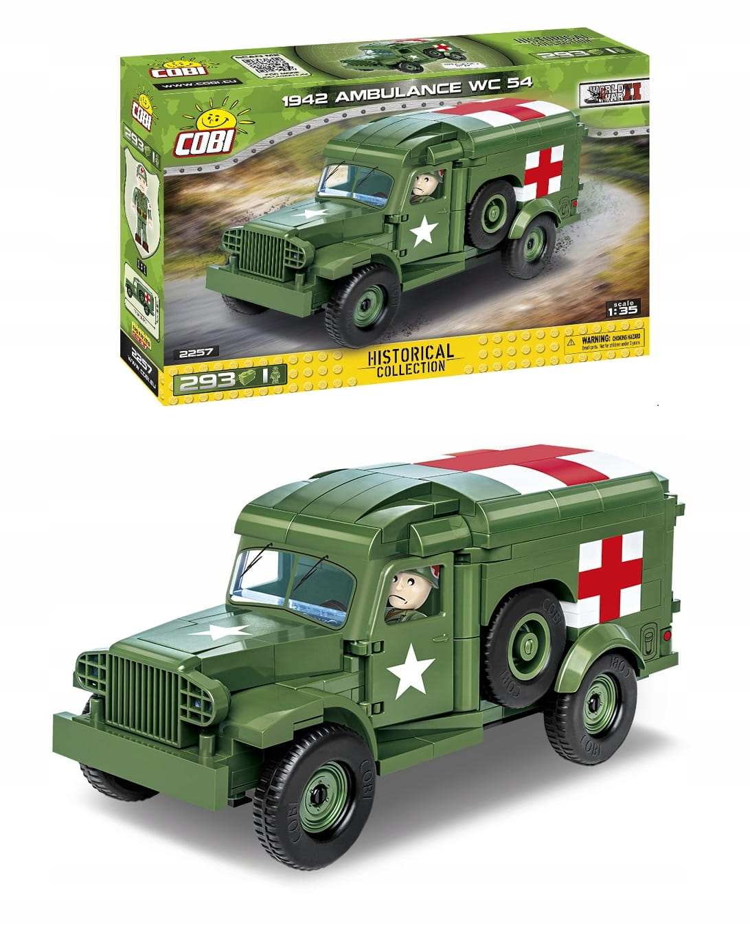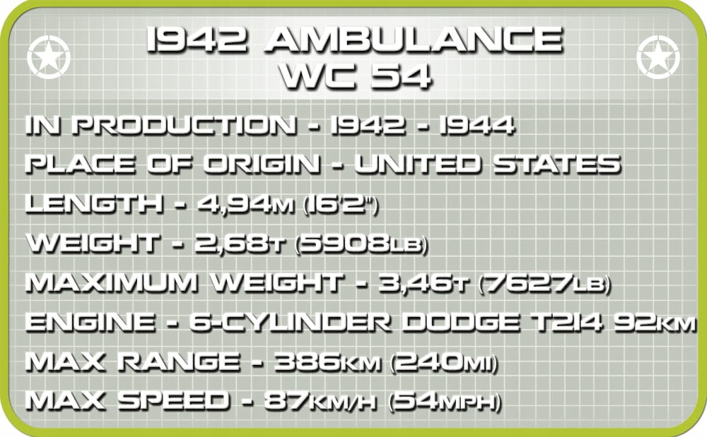 Z zestawu 293 klocków konstrukcyjnych COBI wybudujesz klasyczny amerykański wojskowy ambulans WC 54 w modelarskiej skali 1:35. Jest to bez wątpienia jeden z najbardziej udanych zestawów wydanych w 2021 roku przez COBI. Wszelkie detale graficzne są kompozycjami z klocków oraz wysokiej jakości nadrukami, które nie ścierają się nawet w trakcie intensywnego użytkowania. Konstrukcja pojazdu w wyjątkowy sposób odzwierciedla oryginalne kształty swego historycznego pierwowzoru. Model kontynuuje serię zabytkowych samochodów, które powstały przy wykorzystaniu specjalnie do tego celu zaprojektowanych elementów.