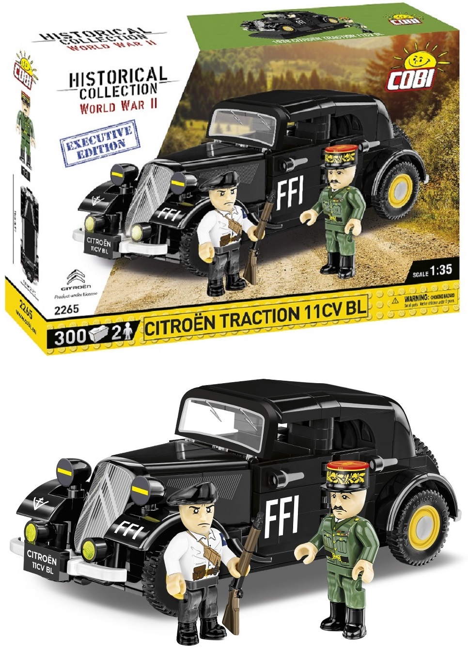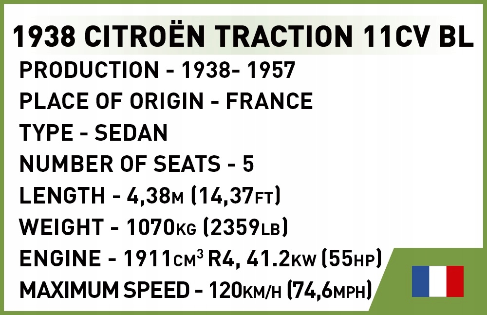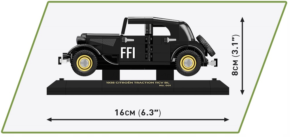 Samochód Citroen Traction 11CV BL w wersji EXECUTIVE EDITION to zestaw składający się w ogromną dawkę historii, którą zbudujesz klocek po klocku! Oryginalne auto było produkowane w latach 1937-1957. Wyróżniało się samonośnym nadwoziem i przednim napędem. Powszechnie przyjęta i zarazem nieoficjalna nazwa samochodu to Traction Avant, oznaczająca z języka francuskiego „napęd przedni”. Nasz model wyposażony jest w historyczne emblematy Francuskich Sił Wewnętrznych (fr. Forces françaises de l'Intérieur). FFI była jednolitą organizacją jednoczącą wszystkie stronnictwa francuskiego Ruchu Oporu w czasie II wojny światowej!