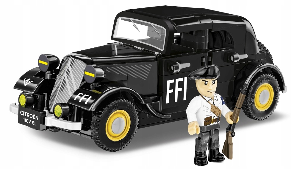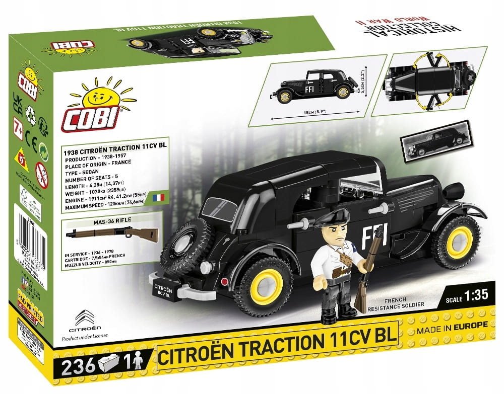 Samochód Citroen Traction 11CV BL został starannie odtworzony z klocków konstrukcyjnych COBI. Auto uzupełnia bogatą kolekcję historycznych pojazdów wydanych w modelarskiej skali 1:35. Zestaw zawierający 236elementów to nie tylko samochód z obracającymi się kołami, otwieranymi drzwiami ale też figurka postaci historycznej(szeregowy członek żołnierza francuskiego ruchu oporu (Resistance) w charakterystycznym uniformie i z opaską na ręku!). Zestaw zawiera wyłącznie wysokiej jakości nadruki, które nie ścierają się nawet w trakcie intensywnego użytkowania. Za sprawą nadruków i postaci samochód nabiera jeszcze bardziej historycznego wymiaru.