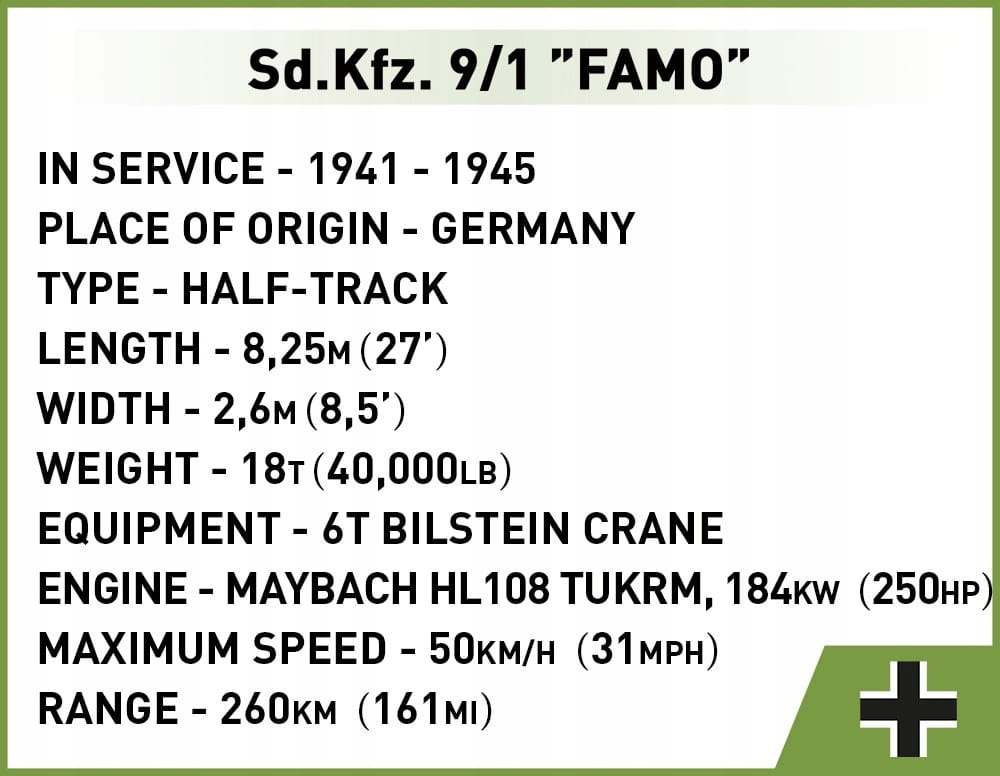 Sd.Kfz. 9/1 “Famo” został opracowany w skali 1:35 pasującej do figurek i składa się z 498 klocków konstrukcyjnych. Funkcjonalności modelu to: działająca trakcja gąsienicowa, obracające się koła, miejsca siedzące dla figurek, obracający się dźwig wyposażony w ruchome ramię, podnoszone podpory, hak, na którym możemy podwiesić klockowy silnik.