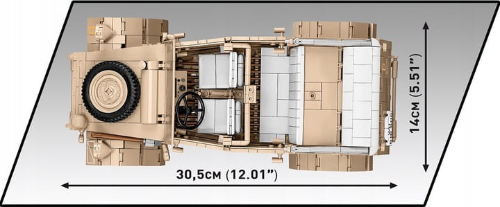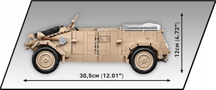 Po złożeniu Kübelwagen ma 30,5 cm długości. Uwagę zwraca starannie odwzorowane wnętrze, doskonały zewnętrzny design, zupełnie nowe elementy zaprojektowane specjalnie na potrzeby tak dużego zestawu. Wnętrze auta jest szczegółowo odwzorowane w każdej jego części, włączając w to kierownicę, fotele, gałki, przełączniki i komorę silnika zawierającą dodatkowe narzędzia! Zewnętrzna strona również podnosi poprzeczkę pod względem dokładności proporcji i detali, które może zapewnić jedynie zestaw tej wielkości. Wystarczy tylko wspomnieć o dedykowanej szybie, otwieranych drzwiach, dostępie do klapy bagażnika i komory silnika, elementach wyposażenia oraz skrętnych kołach, którymi można poruszać za pomocą kierownicy. Nasze modele w skali 1:28 uchodzą za bardzo szczegółowe.