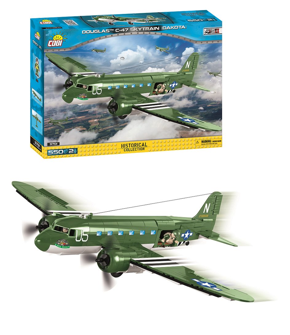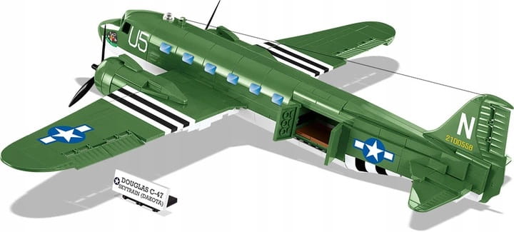 Model z klocków konstrukcyjnych COBI przedstawiający amerykański samolot transportowy Douglas C-47 Skytrain (Dakota) w specjalnej wersji D-Day Edition wydanej z okazji 75 rocznicy inwazji na Normandię posiada ruchome elementy takie jak obrotowe koła z gumowymi oponami, ruchome śmigła i lotki skrzydeł oraz otwierane drzwi. W zestawie dostępne są także dwie figurki amerykańskich żołnierzy: pilota i spadochroniarza ze 101 Dywizji Powietrznodesantowej “Screaming Eagles” z charakterystycznym hełmem i plecakiem spadochronowym.
