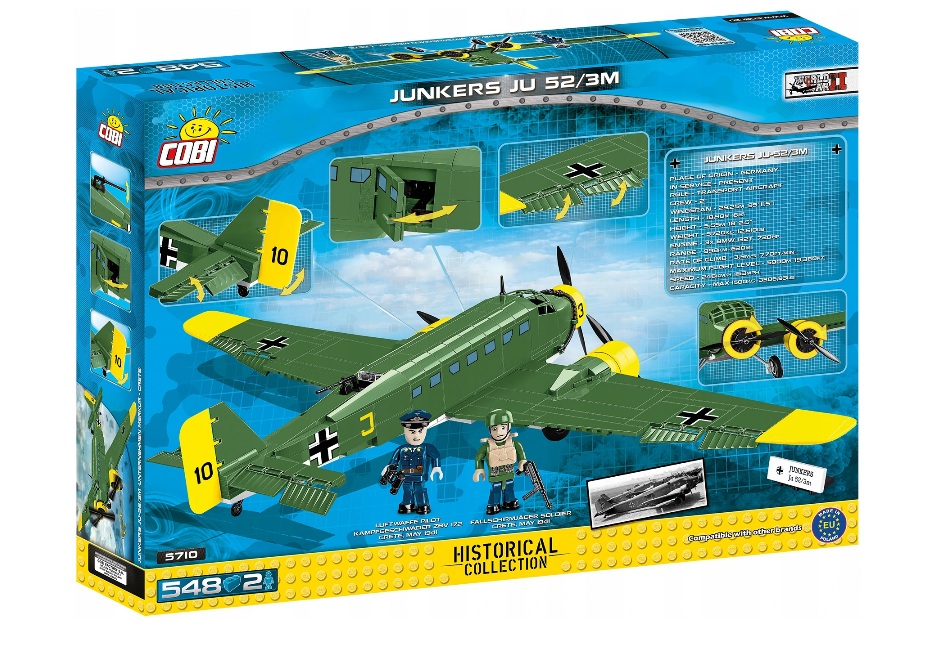 Model z klocków konstrukcyjnych posiada wiele ruchomych elementów takich jak obrotowe koła z gumowymi oponami, ruchome śmigła i lotki. Otwierane drzwi do przedziału transportowego i kabina umożliwiają umieszczenie wewnątrz figurki pilota oraz spadochroniarza niemieckiego (Fallschirmjäger). Klockowy model został wyprodukowany w malowaniu, jakie wykorzystywało Luftwaffe w trakcie desantu na Krecie. Klocki zostały pokryte wysokiej jakości nadrukami, które nie ścierają się nawet w trakcie intensywnego użytkowania. To świetna zabawka dla wszystkich najmłodszych pasjonatów lotnictwa. Dzięki wiernie odwzorowanym proporcjom i detalom samolotu model znakomicie sprawdzi się jako ozdoba każdej kolekcji młodego i dorosłego pasjonata historii oraz lotnictwa.