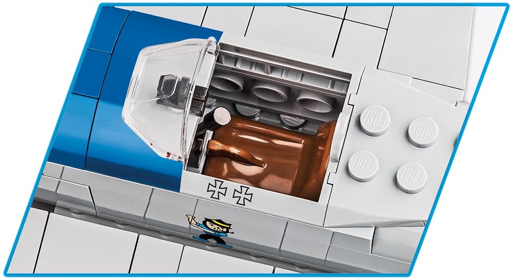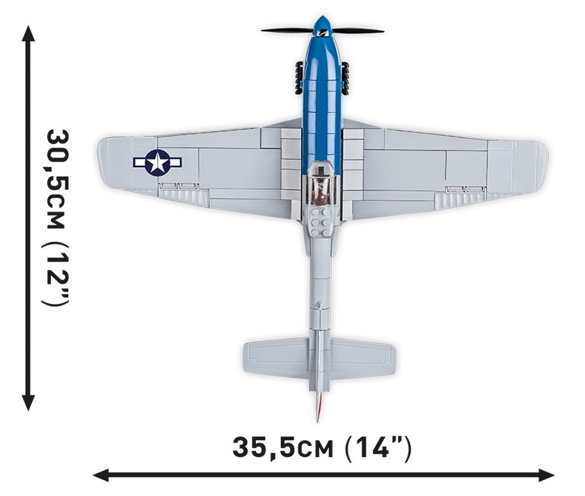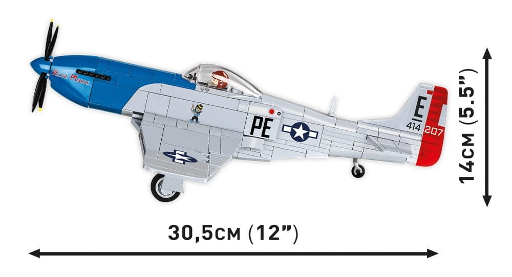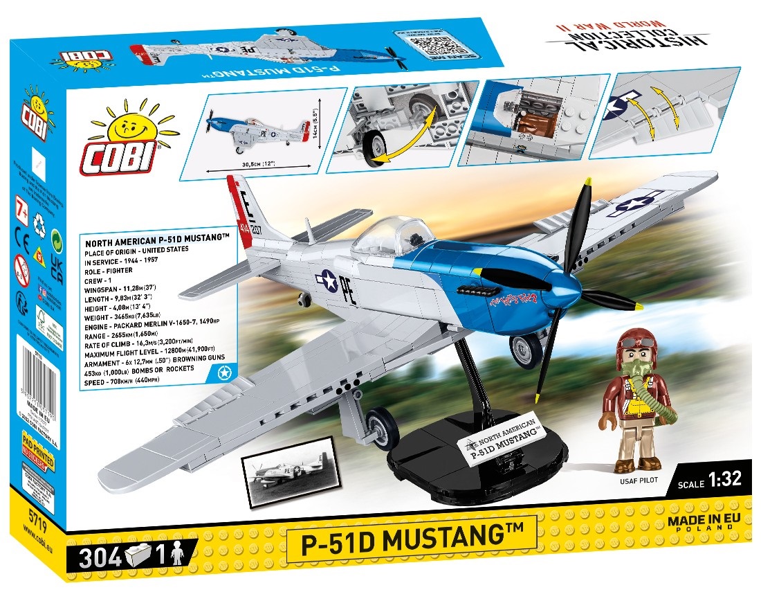 Zbuduj przepięknego Mustanga w modelarskiej skali 1:32. Model został wiernie odwzorowany z 304 klocków konstrukcyjnych COBI. W zestawie znajdziesz wysokiej jakości nadruki. Model został wyposażony w obracające się śmigła, zamykane podwozie, ruchome koła i otwieraną kabinę pilota, w której można umieścić naszą figurkę inspirowaną postacią historyczną.