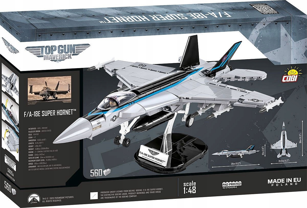 Legendarny filmowy pilot i instruktor marynarki wojennej USA Pete „Maverick” Mitchell szkoli nowe pokolenie pilotów na takich właśnie maszynach. Zbuduj własnego Super Horneta w modelarskiej skali 1:48. Model został wiernie odwzorowany z 560 klocków konstrukcyjnych COBI.