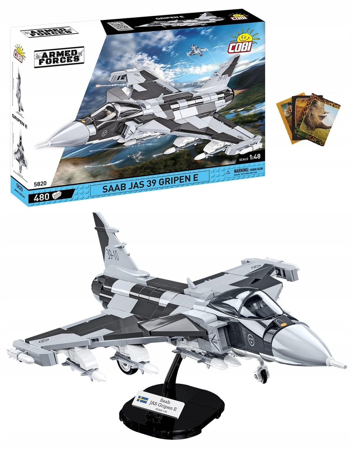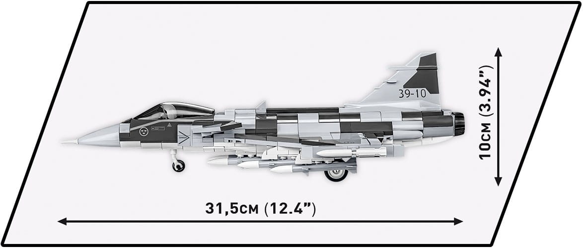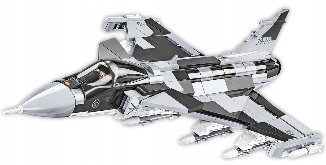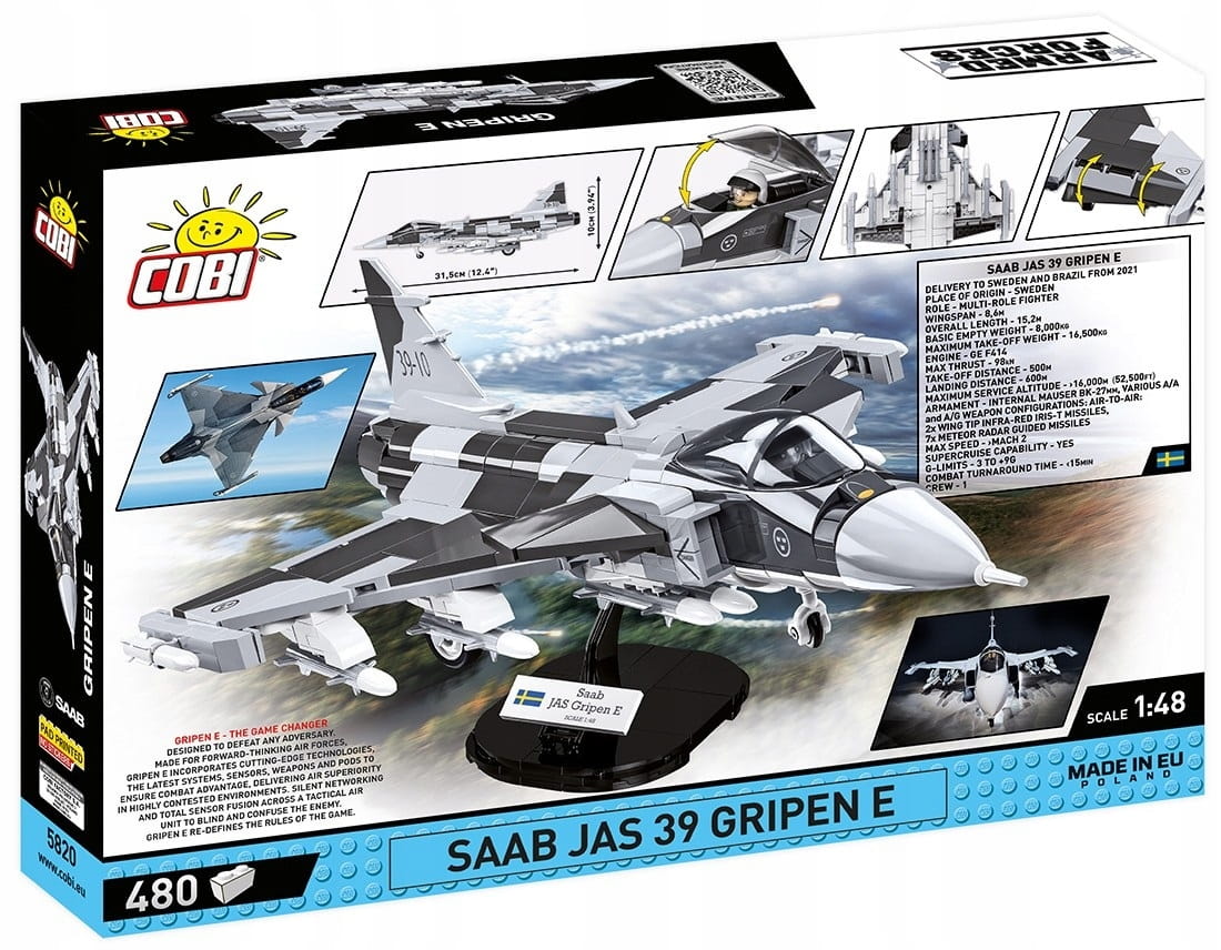 Z 480 klocków konstrukcyjnych COBI wybudujesz wydany na licencji koncernu zbrojeniowego SAAB nowoczesny, wielozadaniowy myśliwiec JAS 39 GRIPEN E w barwach sił powietrznych Szwecji. Zestaw został starannie zaprojektowany w modelarskiej skali 1:48. Klocki zostały pokryte wysokiej jakości nadrukami. Do zestawu dołączony jest specjalny korpus pilota, który można umieścić w otwieranym kokpicie. Całość zestawu uzupełnia klockowa podstawka ekspozycyjna z tabliczką zawierającą nazwę zestawu i flagę państwową Szwecji!