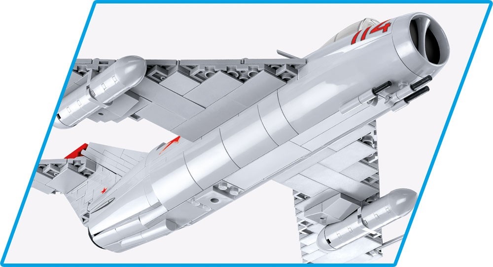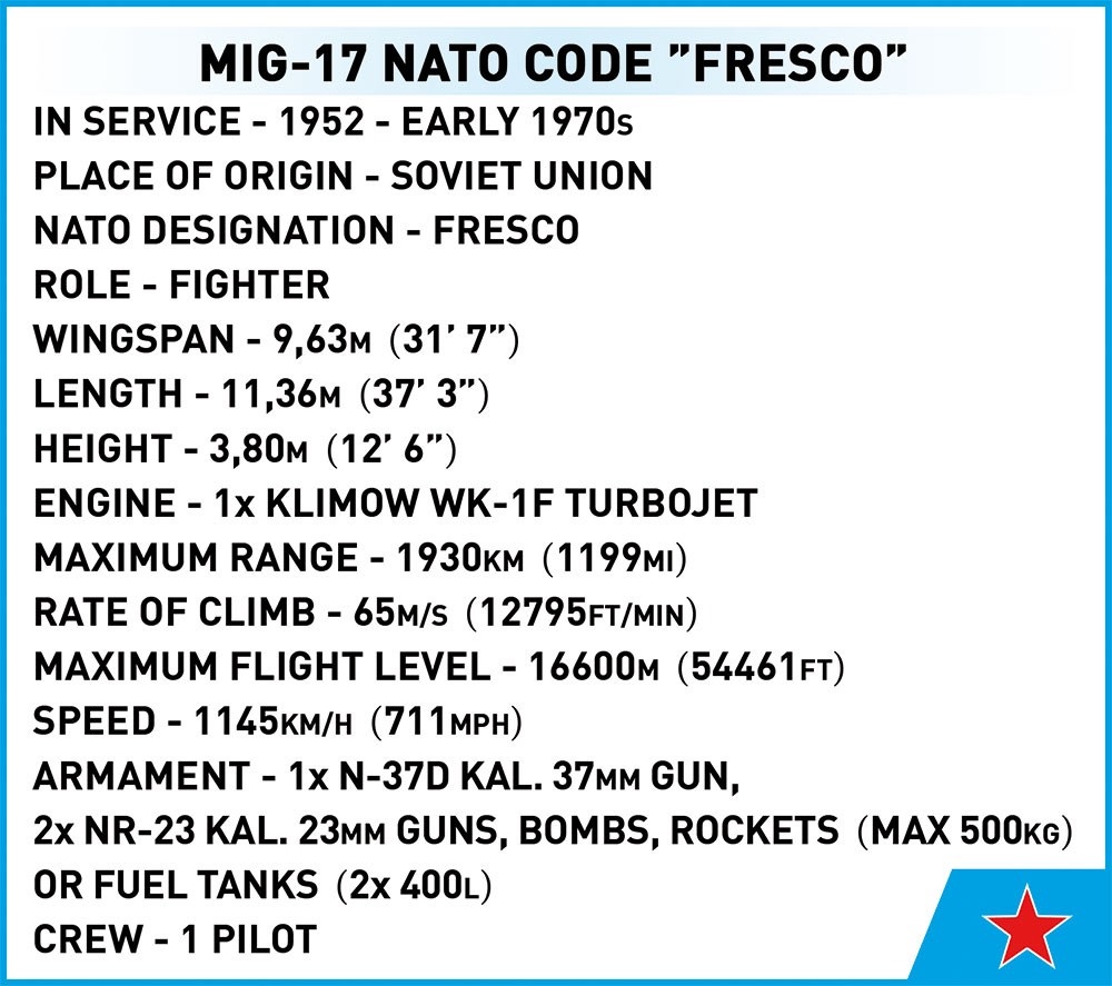 Model samolotu MIG-17 został zaprojektowany w modelarskiej skali 1:32 i składa się z 568 wysokiej jakości elementów. Wszystkie oznaczenia, emblematy i napisy znajdujące się na modelu to nadruki, które nie ścierają się w trakcie użytkowania. Zestaw posiada ruchome elementy takie jak koła oraz otwierana kabina, w której możemy umieścić rewelacyjną figurkę pilota. Szczególnie pięknie prezentuje się odwzorowany z klocków kamuflaż. Do zestawu dołączona jest podstawka ekspozycyjna zawierająca tabliczkę z nazwą zestawu i oznaczeniem przynależności państwowej. Dzięki intuicyjnej instrukcji opartej na czytelnych ikonach budowa jest prosta. Samolot to pozycja obowiązkowa dla wszystkich fanów lotnictwa, militariów i techniki wojskowej. Stanowi również doskonałe uzupełnienie kolekcji Armed Forces, Vietnam War, Cold War i Korean War.