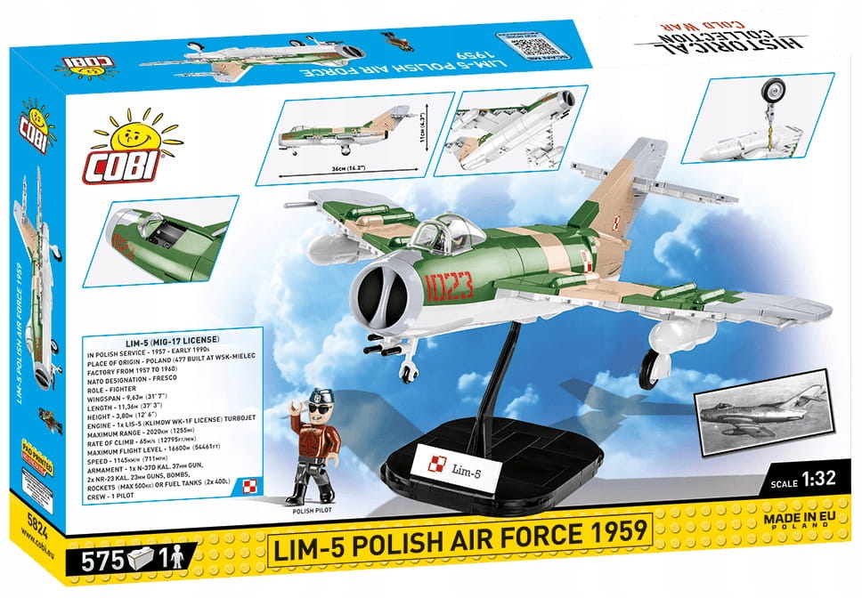 Model samolotu LIM-5 (MIG-17F ) został zaprojektowany w modelarskiej skali 1:32 i składa się z 575 wysokiej jakości elementów. Wszystkie oznaczenia i napisy znajdujące się na modelu to nadruki, które nie ścierają się w trakcie użytkowania. Zestaw posiada ruchome elementy takie jak koła oraz otwierana kabina, w której możemy umieścić rewelacyjną figurkę polskiego pilota, wyposażonego w furażerkę z nadrukowanym stopniem i emblematem lotnictwa polskiego. Szczególnie pięknie prezentuje się odwzorowany z klocków kamuflaż. Do zestawu dołączona jest podstawka ekspozycyjna zawierająca tabliczkę z nazwą zestawu i oznaczeniem przynależności państwowej. Dzięki intuicyjnej instrukcji opartej na czytelnych ikonach budowa jest prosta.