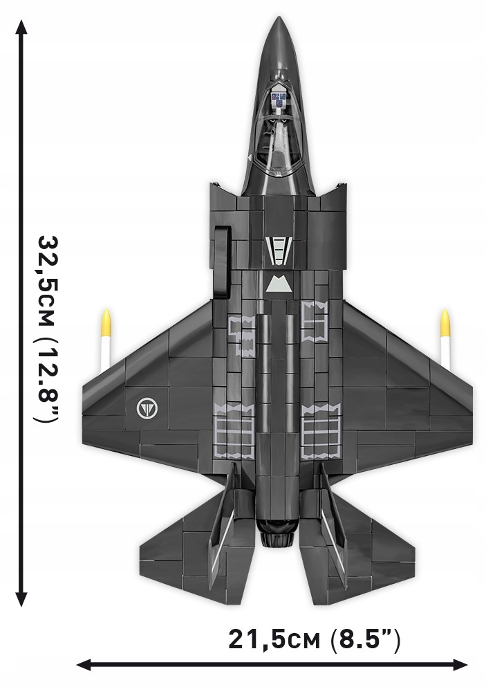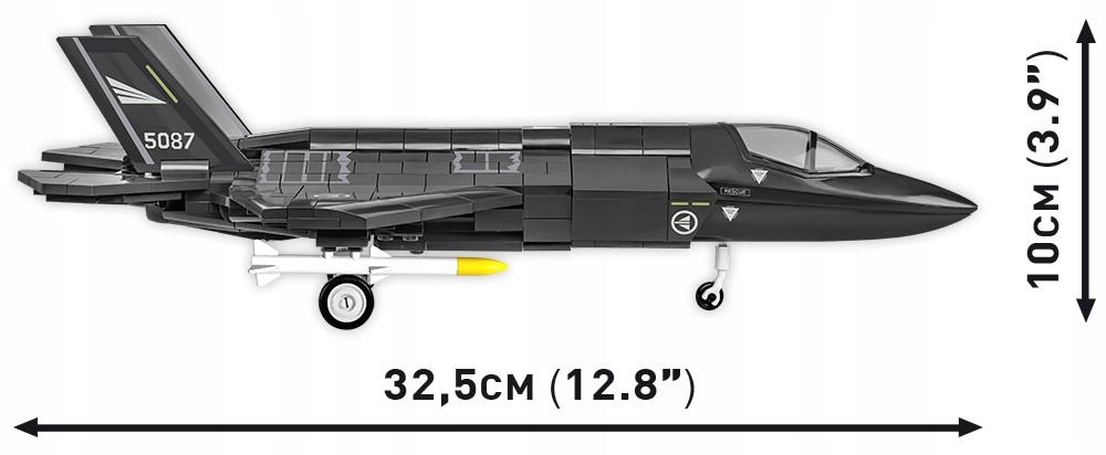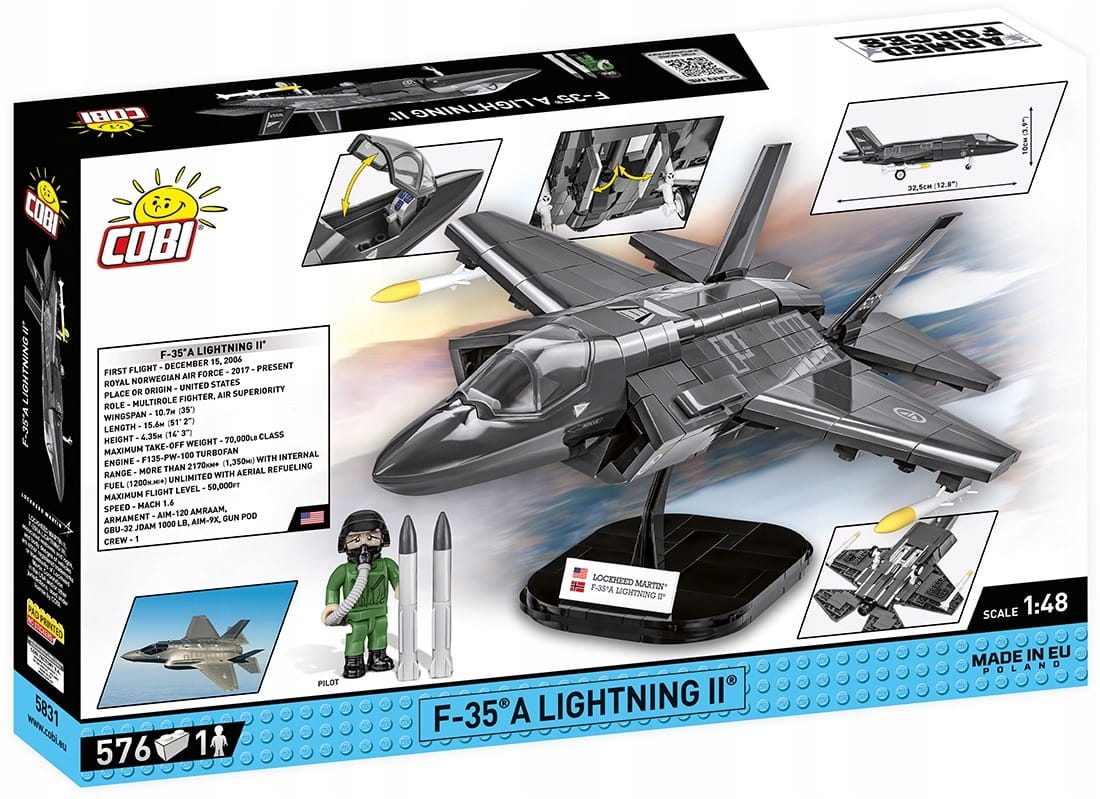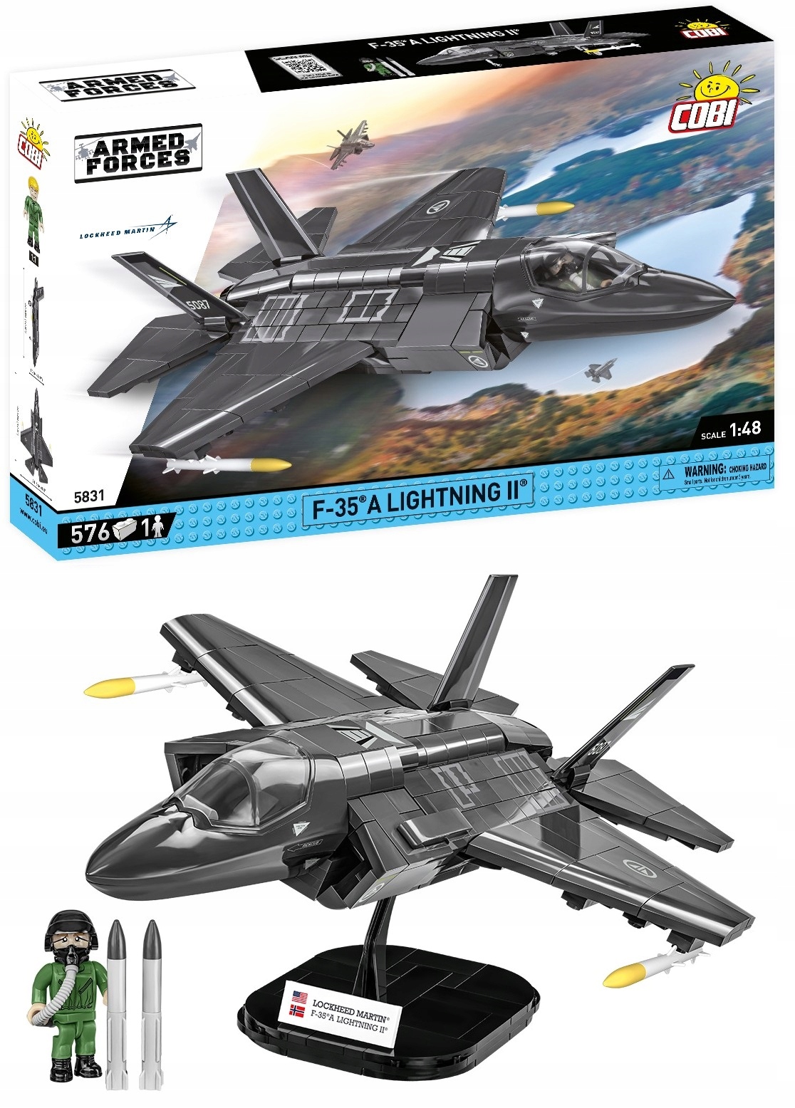 Z 576 najwyższej jakości klocków konstrukcyjnych COBI wybudujesz wydany na licencji megakoncernu zbrojeniowego Lockheed Martin najnowocześniejszy na świecie wielozadaniowy myśliwiec F-35®A LIGHTNING II®. Zestaw został starannie zaprojektowany w modelarskiej skali 1:48. Specjalnie zaprojektowane na potrzeby tego zestawu klocki zostały pokryte wysokiej jakości nadrukami. Charakterystyczna kabina pilota wykonana jest w sposób bardzo realistyczny i można ją otwierać, aby mieścić w środku figurkę pilota wyposażonego w kask i maskę tlenową z wężykiem. Kupując samolot, zbudujesz również klockową podstawkę ekspozycyjną z tabliczką zawierającą nazwę zestawu!