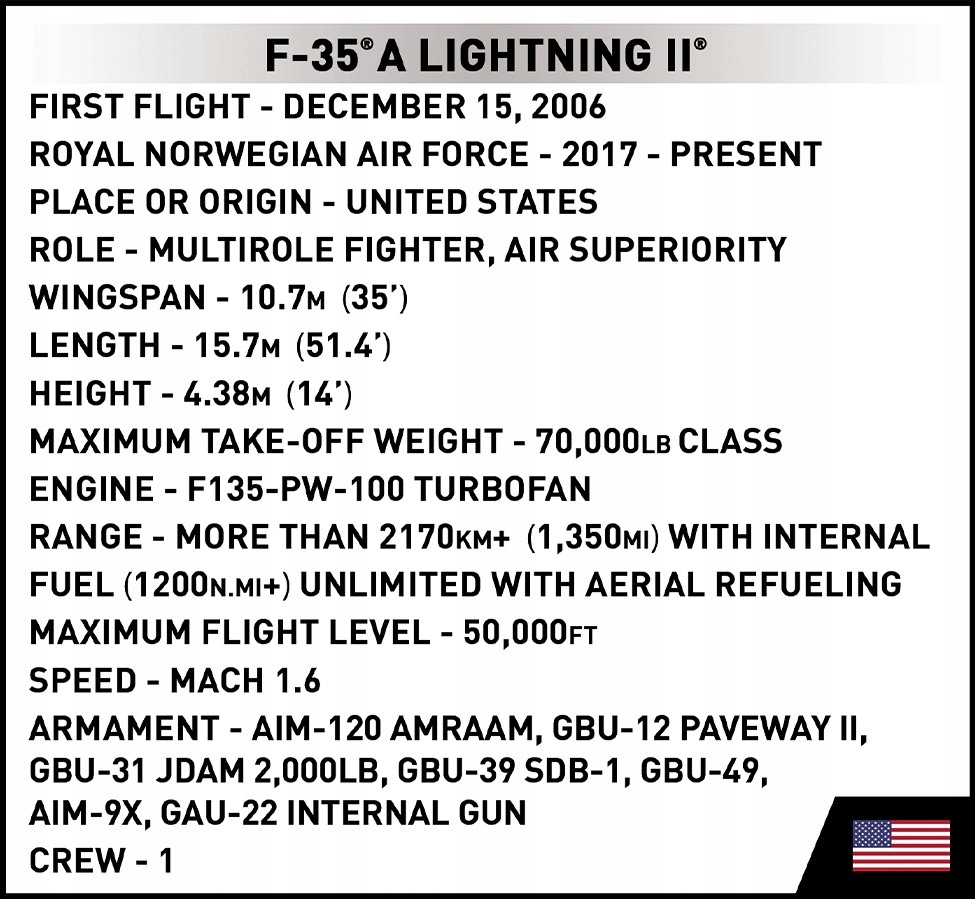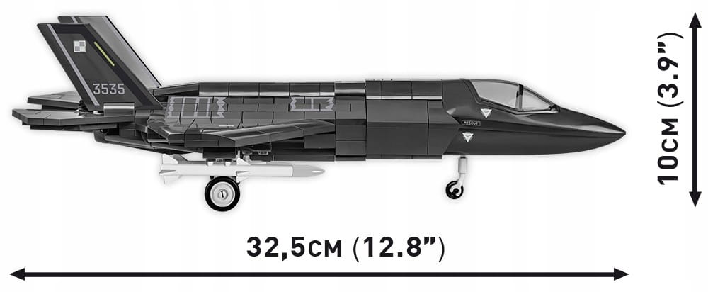 Z 580 najwyższej jakości klocków konstrukcyjnych COBI wybudujesz wydany na licencji megakoncernu zbrojeniowego Lockheed Martin najnowocześniejszy na świecie wielozadaniowy myśliwiec F-35®A LIGHTNING II®. Zestaw został starannie zaprojektowany w modelarskiej skali 1:48. Specjalnie zaprojektowane na potrzeby tego zestawu klocki zostały pokryte wysokiej jakości nadrukami. Charakterystyczna kabina pilota wykonana jest w sposób bardzo realistyczny i można ją otwierać, aby mieścić w środku figurkę pilota wyposażonego w kask i maskę tlenową z wężykiem. Kupując samolot, zbudujesz również klockową podstawkę ekspozycyjną z tabliczką zawierającą nazwę zestawu!