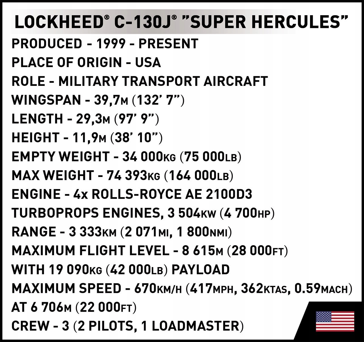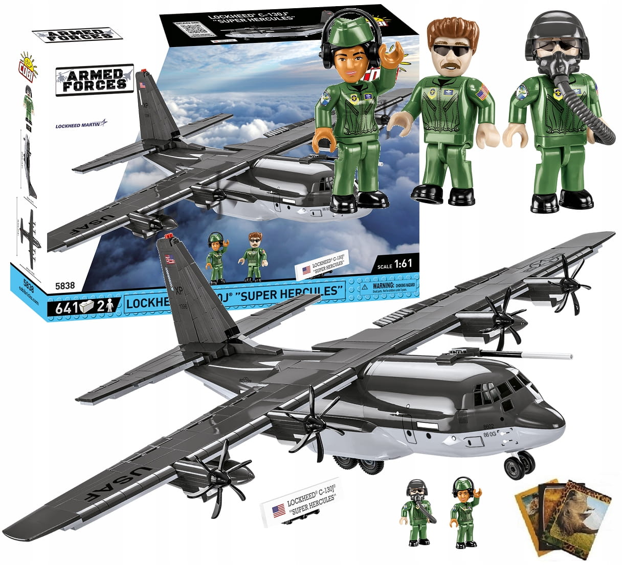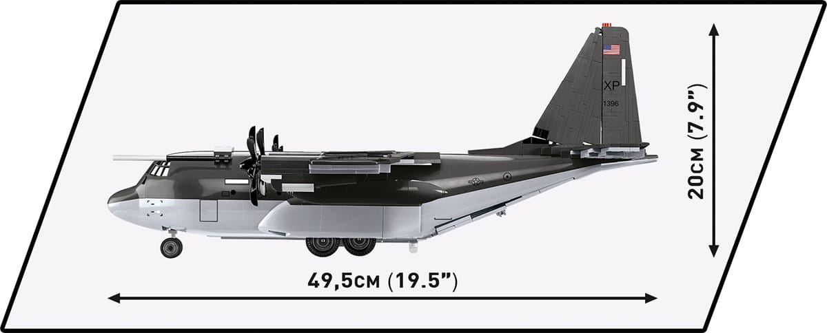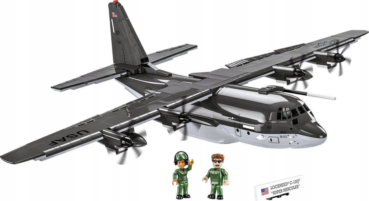 Wydany na licencji Lockheed Martin wojskowy samolot transportowy C-130J® Super Hercules został zaprojektowany w skali 1:61 przy wykorzystaniu 641 elementów i ma aż 70,5 cm rozpiętości skrzydeł!