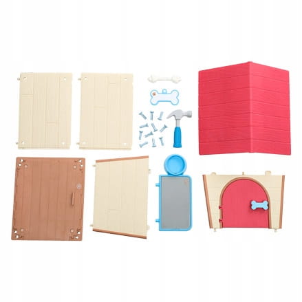 Zbuduj domek z zawartych w zestawie elementów, nalej wodę do miseczki, nadaj imię swojemu pieskowi i przybij tabliczkę z imieniem nad drzwiami domku……