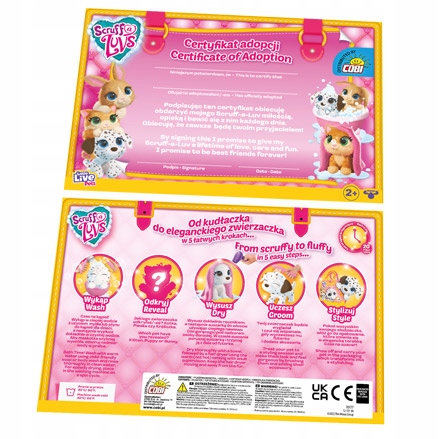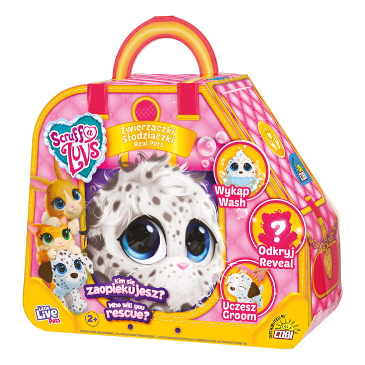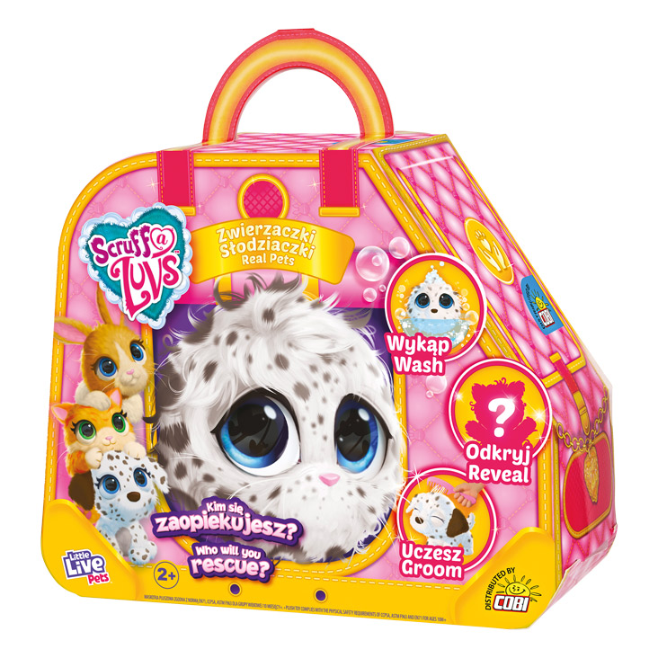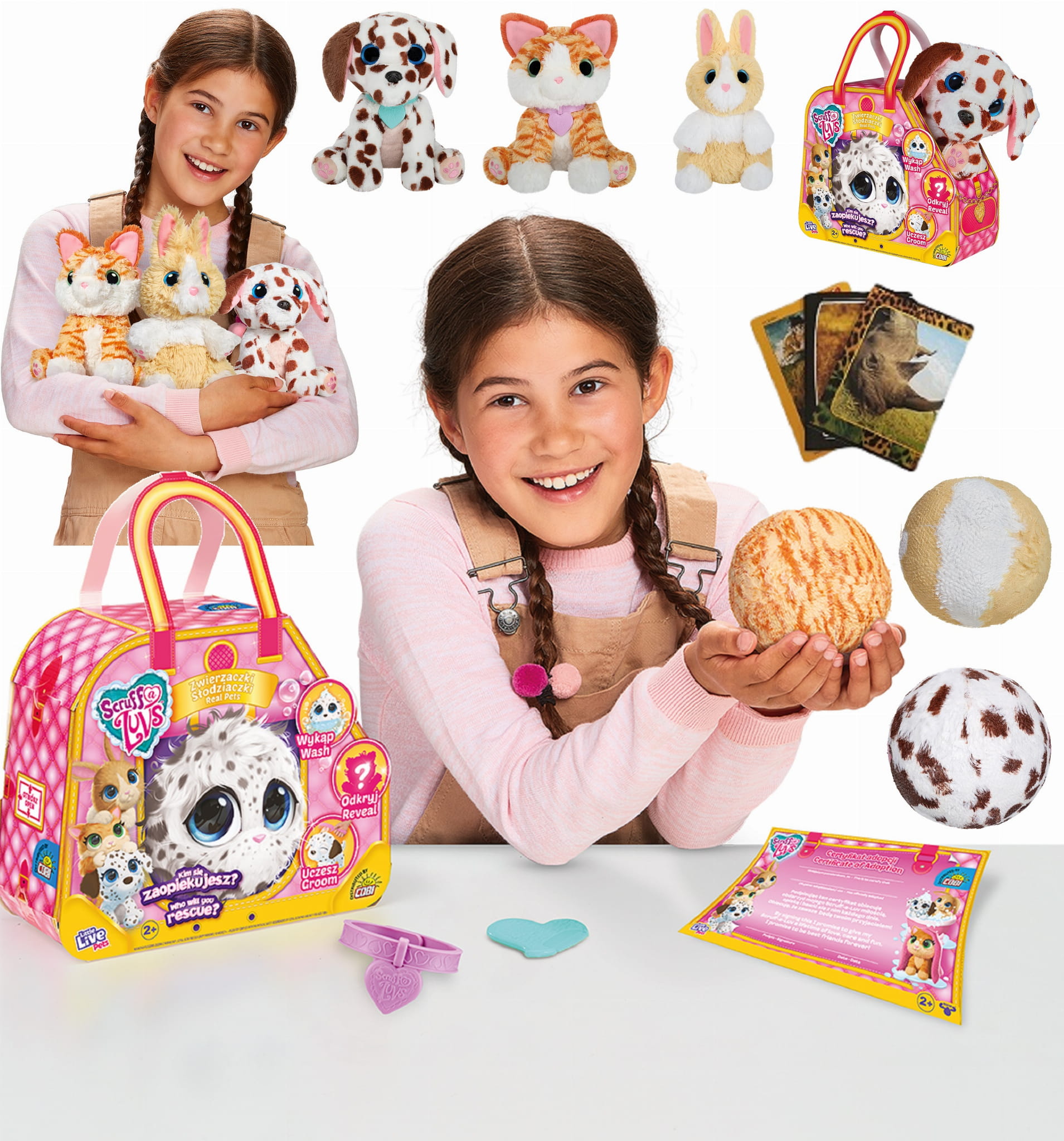 Wewnątrz pudełka znajduje się jeden tajemniczy zwierzak czekający na ratunek! Którego Scruff-a-Luvs uratujesz? Czy w środku znajdziesz króliczka, szczeniaczka a może kotka Scruff-a-Luvs? Na początku zwierzaczek wygląda jak smutna, futrzasta kulka, ale gdy go wykąpiesz odsłonisz jego prawdziwe futerko. Wysusz je, uczesz przy pomocy grzebyka i nałóż obróżkę.