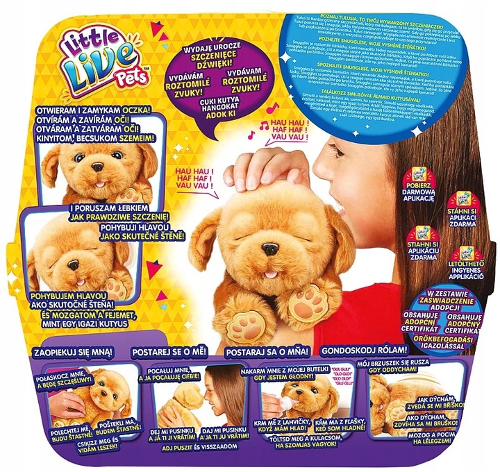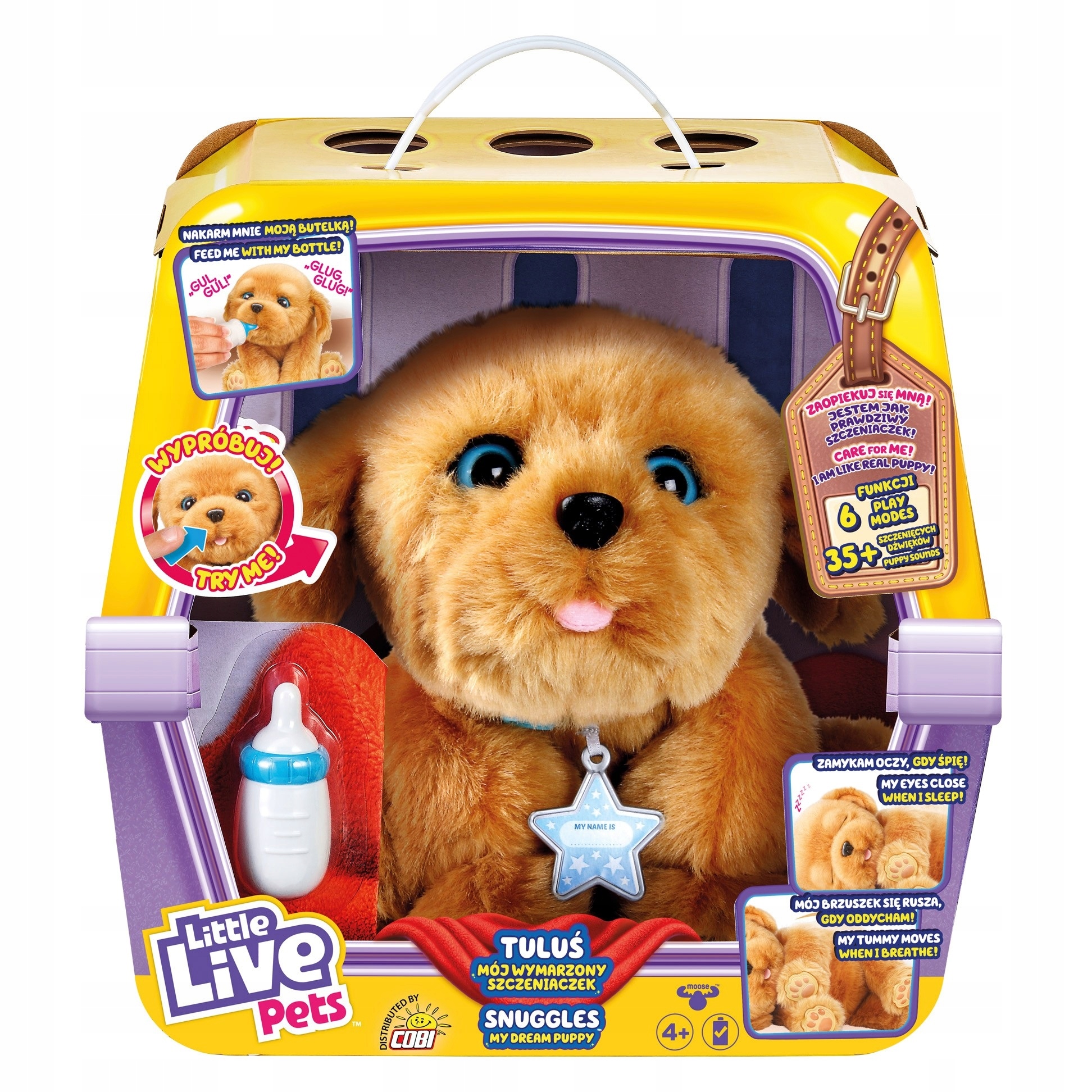 To bardzo grzeczny szczeniaczek, który tylko czeka aż go adoptujesz. On uwielbia się przytulać. Tuluś reaguje jakby był prawdziwym szczeniaczkiem. Gdy poklepiesz go po łebku lub pogłaszczesz po brzuszku, zareaguje wydając dźwięki. Tuluś otwiera też oczka i porusza łebkiem. Możesz go również nakarmić, a ze szczęścia wyda sekretne dźwięki. Zamyka oczy, gdy śpi i porusza brzuszkiem jak oddycha. Szczeniaczek ma 6 funkcji i 35 dźwięków.
