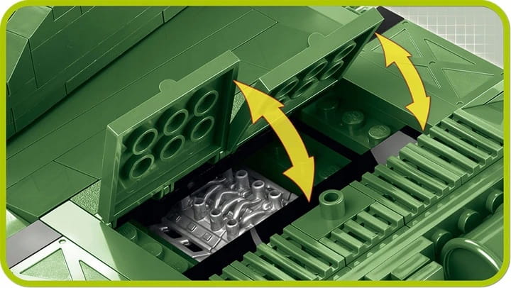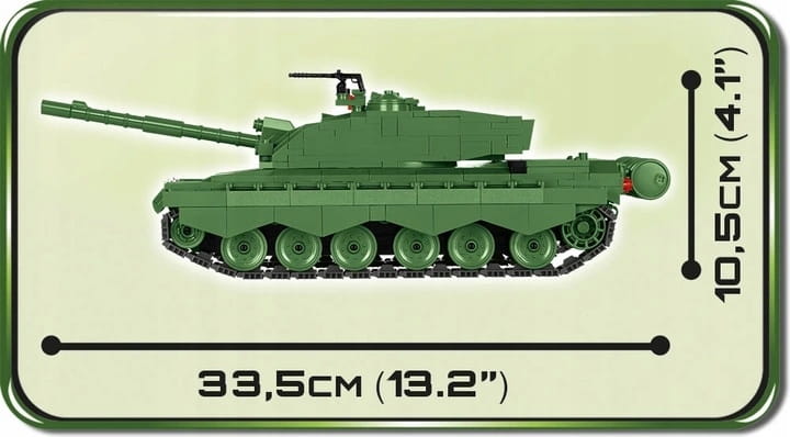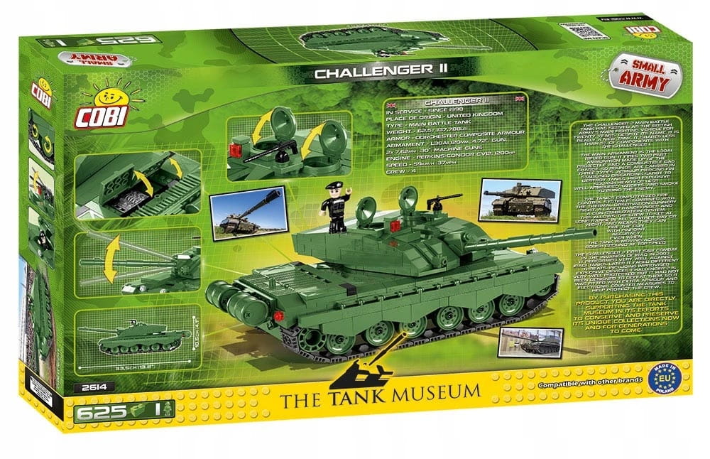 Challenger 2 to brytyjski czołg podstawowy trzeciej generacji. Produkowany jest w Wielkiej Brytanii od początku lat 90. XX wieku. To ulepszona i zmodernizowana wersja starszego modelu o tej samej nazwie. Rozpoczął swą służbę w 1994 r. Jego załogę stanowią cztery osoby. Model z klocków konstrukcyjnych COBI to znakomite połączenie wysokiej jakości i trwałej zabawki przeznaczonej dla małych fascynatów klocków konstrukcyjnych i militariów, z produktem przeznaczonym dla wymagających kolekcjonerów i znawców broni pancernej. Pojazd posiada wiele ruchomych elementów takich jak: otwierane włazy, obrotowa wieża, podnoszona i opuszczana lufa, obrotowe koła i gąsienice, które w czasie zabawy wydają charakterystyczne skrzypienie i chrobotanie przypominające dźwięk poruszającego się prawdziwego czołgu. W komplecie znajduje się również figurka pracownika The Tank Museum, która to placówka jest partnerem wydania tego zestawu. 625 wysokiej jakości elementy, wyprodukowane w UE przez firmę z ponad 20-letnią tradycją, spełniają normy bezpieczeństwa dotyczące produktów dla dzieci, w pełni kompatybilne z innymi markami klocków konstrukcyjnych, klocki z nadrukami nie odkształcają się i nie bledną w czasie zabawy czy pod wpływem temperatury, czytelna i intuicyjna instrukcja oparta na rysunkach i ikonach, figurka czołgisty, zestaw wydany przy współpracy z The Tank Museum