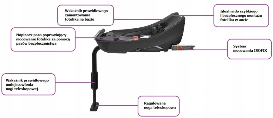 Bezpieczna i prosta instalacja dla zapewnienia maksymalnej wygody i bezpieczeństwa.Nie trzeba już przypinać za każdym razem fotelika pasami samochodowymi fotelika – zamiast tego wpinany w samochodzie na stałe bazę na ISOFIX lub montujemy PASAMI (W pojazdach niewyposażonych w zaczepy Isofix).