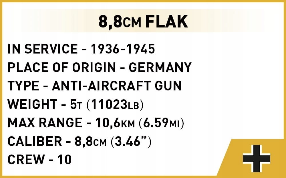 Zaprojektowana w pasującej do figurek skali 1:35 armata składa się z 225 elementów. Zestaw zawiera obracane działo z ruchomą lufą, mnóstwo worków z piaskiem do budowy umocnionego stanowiska, skrzynki, amunicję i narzędzia. Do zestawu dołączona jest dopracowana figurka żołnierza Lufwaffe z obsługi działa, który jest wyposażony w hełm, pas z puszką i manierką oraz karabin Gewehr 43.