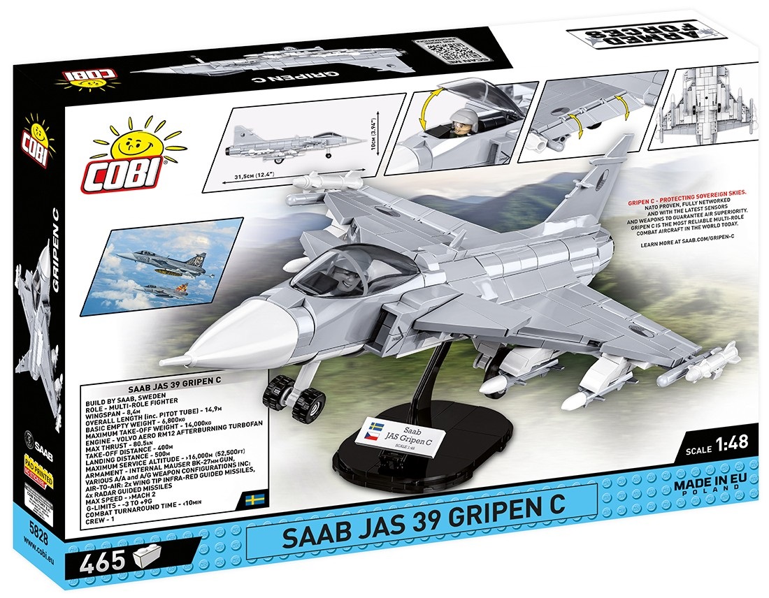 Z 465 klocków konstrukcyjnych COBI wybudujesz wydany na licencji koncernu zbrojeniowego SAAB współczesny wielozadaniowy myśliwiec JAS 39 GRIPEN C w barwach czeskiego lotnictwa wojskowego. Zestaw został starannie zaprojektowany w modelarskiej skali 1:48. Klocki zostały pokryte wysokiej jakości nadrukami. Do zestawu dołączony jest specjalny korpus pilota, który można umieścić w otwieranym kokpicie. Całość zestawu uzupełnia klockowa podstawka ekspozycyjna z tabliczką zawierającą nazwę zestawu!