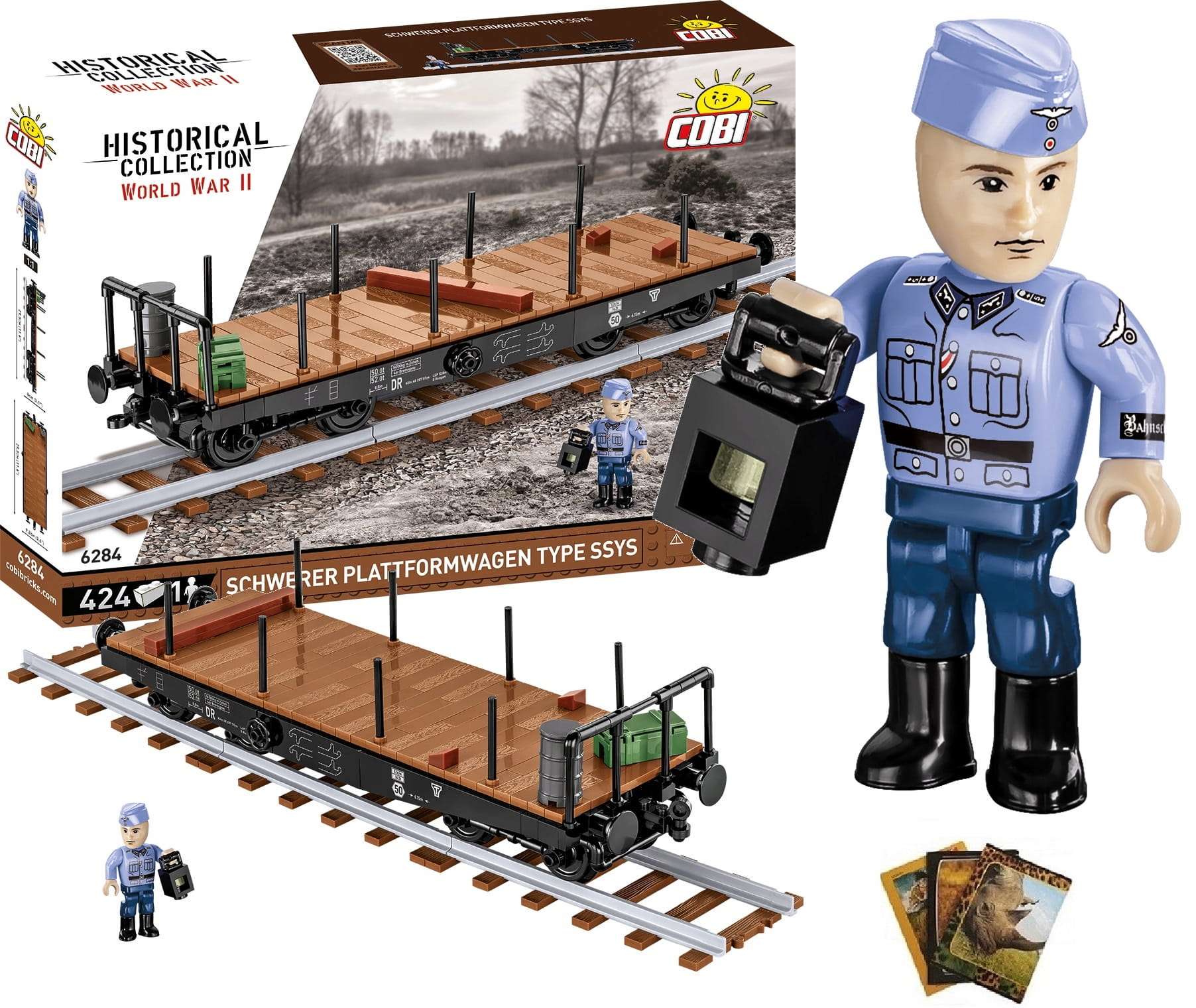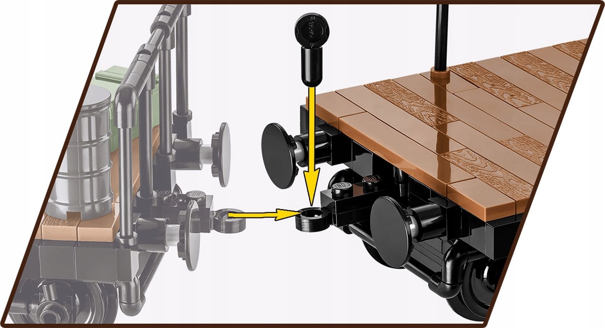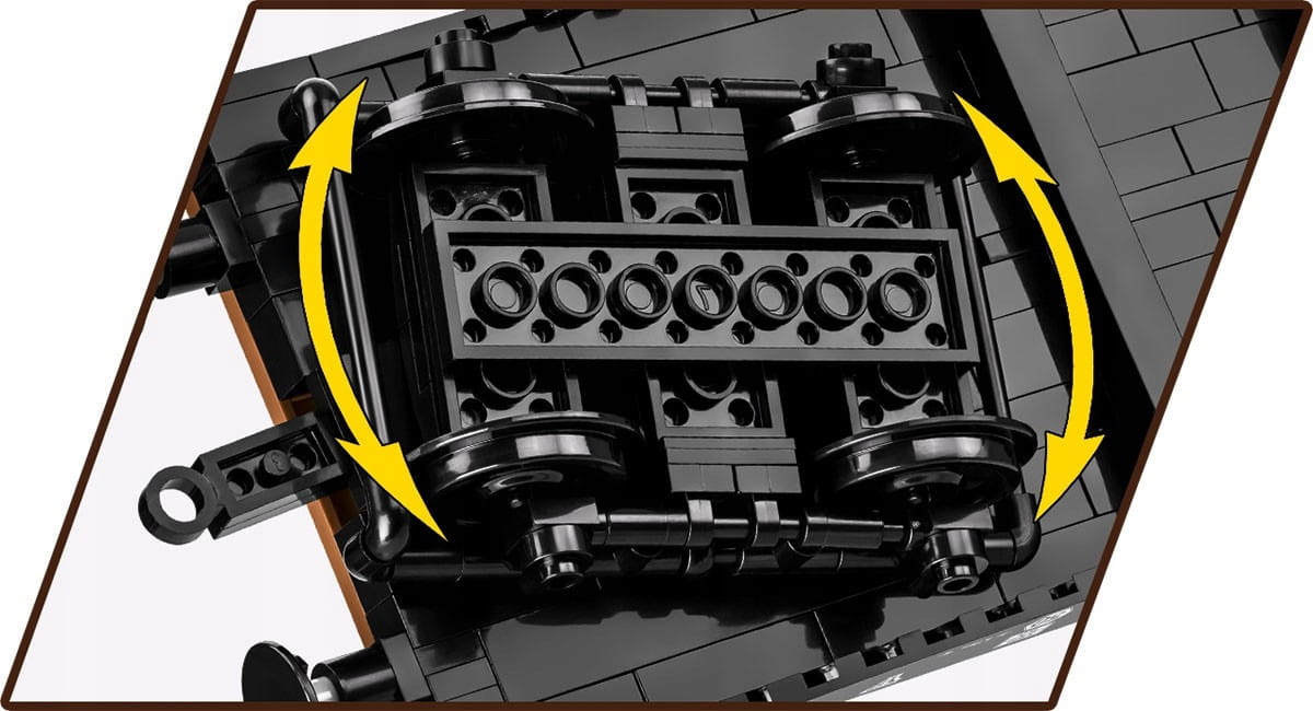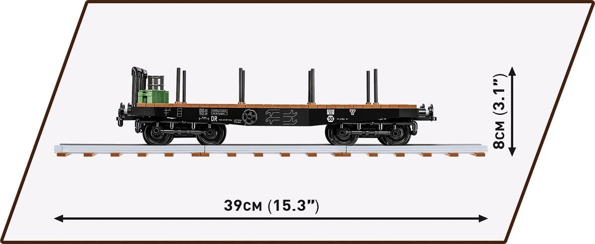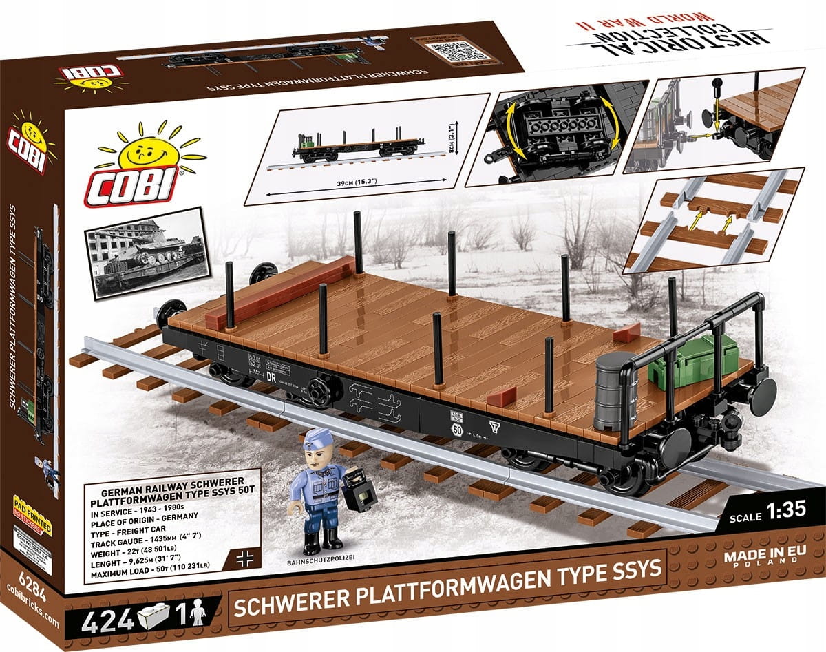 Idealnie nadaje się do transportu czołgów i pojazdów z okresu drugiej wojny światowej, które znajdują się w kolekcji COBI. Oprócz ruchomych wózków i szczegółowych nadruków atrakcyjnym dodatkiem do tego modelu jest figurka niemieckiego strażnika kolejowego z miniaturową lampą.