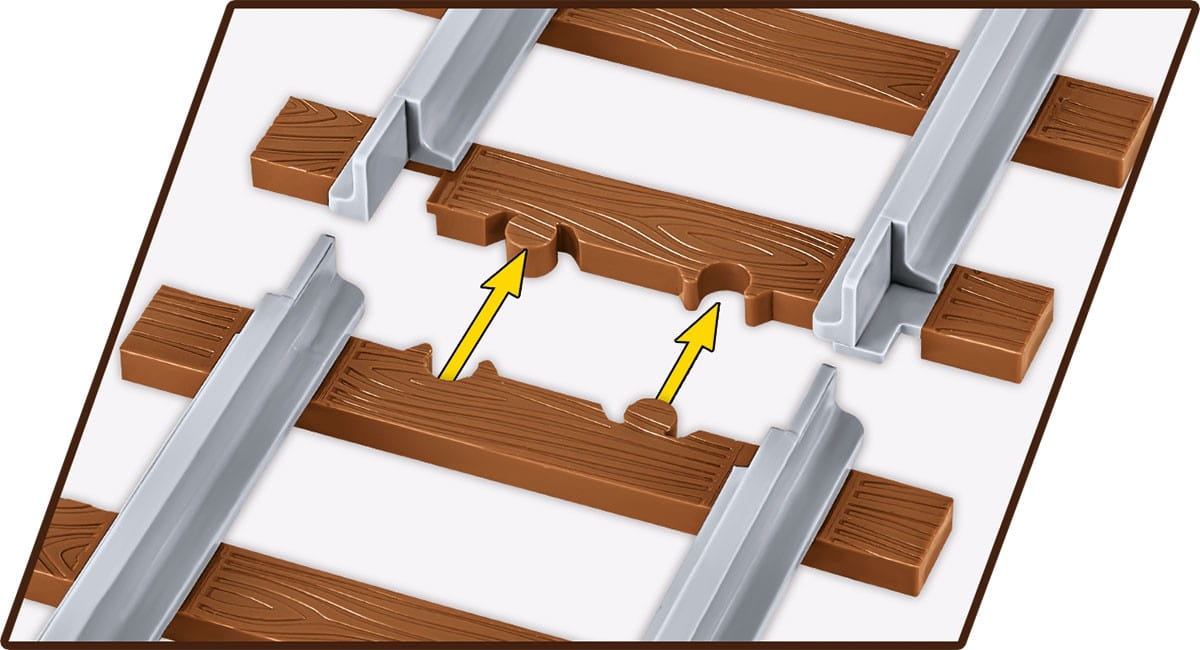 Torowisko wykonane jest w nowoczesnej technologii dwukolorowego wtrysku, co sprawia, że każdy pojedynczy odcinek o długości około 13 cm jest jednym elementem, wyprodukowanym z dwóch różnych kolorów tworzywa, które są połączone ze sobą. Szyny w kolorze szarej stali wyraźnie odcinają się od bardzo realistycznie wykonanych podkładów kolejowych w kolorze brązowym z fakturą drewna! Na każdym kolejowym podkładzie nie ma widocznych czopów (studów), co znacznie poprawia ich realizm. Torowiska mają możliwość wpięcia ich w płyty klockowe konstrukcyjne oraz posiadają otwór techniczny, dzięki któremu można przytwierdzić torowisko na stałe do dioramy kolejowej, używając wkrętu lub gwoździa.