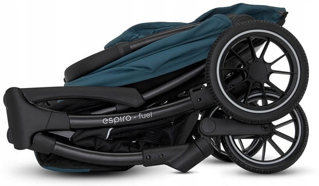 Nowoczesny system składania autofolding zapewnia możliwość złożenia wózka dosłownie jedną ręką. Espiro Fuel to jedyna kompaktowa spacerówka z dużymi kołami, które posiadają pełną amortyzację. Dlatego model Fuel sprawdzi się nie tylko w mieście, ale również poza nim na nieutwardzonych ścieżkach. Do wózka można kupić torbę podróżną, która ochroni wózek podczas podróży samolotem czy dłuższej trasy w samochodzie. W zestawie wraz z wózkiem znajduje się uniwersalna wkładka oraz śpiworkopokrowiec, sprawdzi się on idealnie podczas chłodniejszych dni.