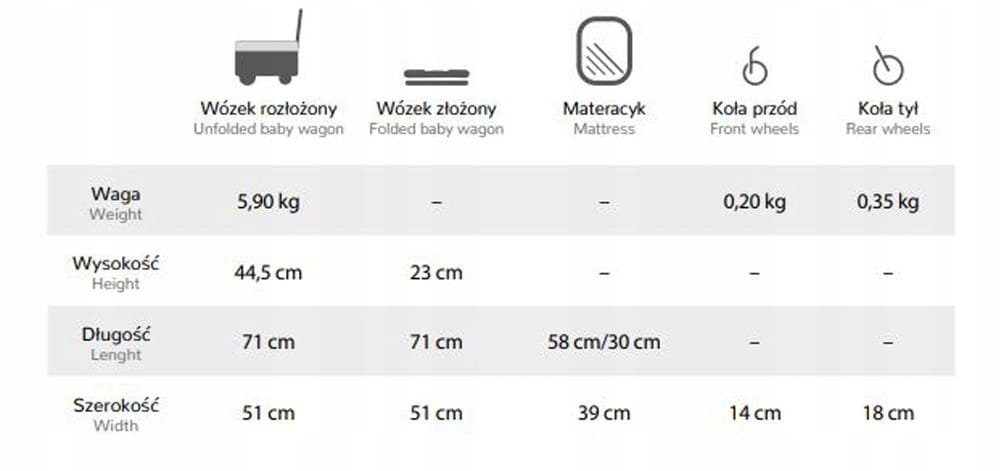 Wózek transportowy wyposażono w funkcjonalny materacyk, do wszechstronnego zastosowania. Wyposażenie dopełnia praktyczny pokrowiec, pełniący funkcje osłonki. Dla zwiększenia bezpieczeństwa po zmroku, wózek posiada elementy odblaskowe.